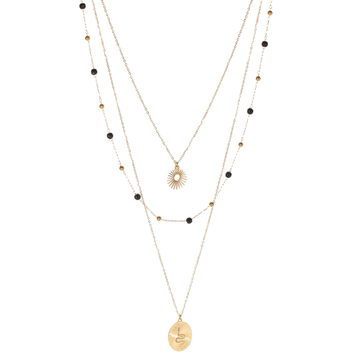 Collier triple rangs composé d'une chaîne de 39 cm de long avec pendentif soleil en acier doré, une chaîne de 44 cm de long avec perles en acier doré et perles en véritable pierre d'agate noire, ainsi qu'une chaîne de 54 cm de long avec pendentif ovale représentant un serpent en acier doré.