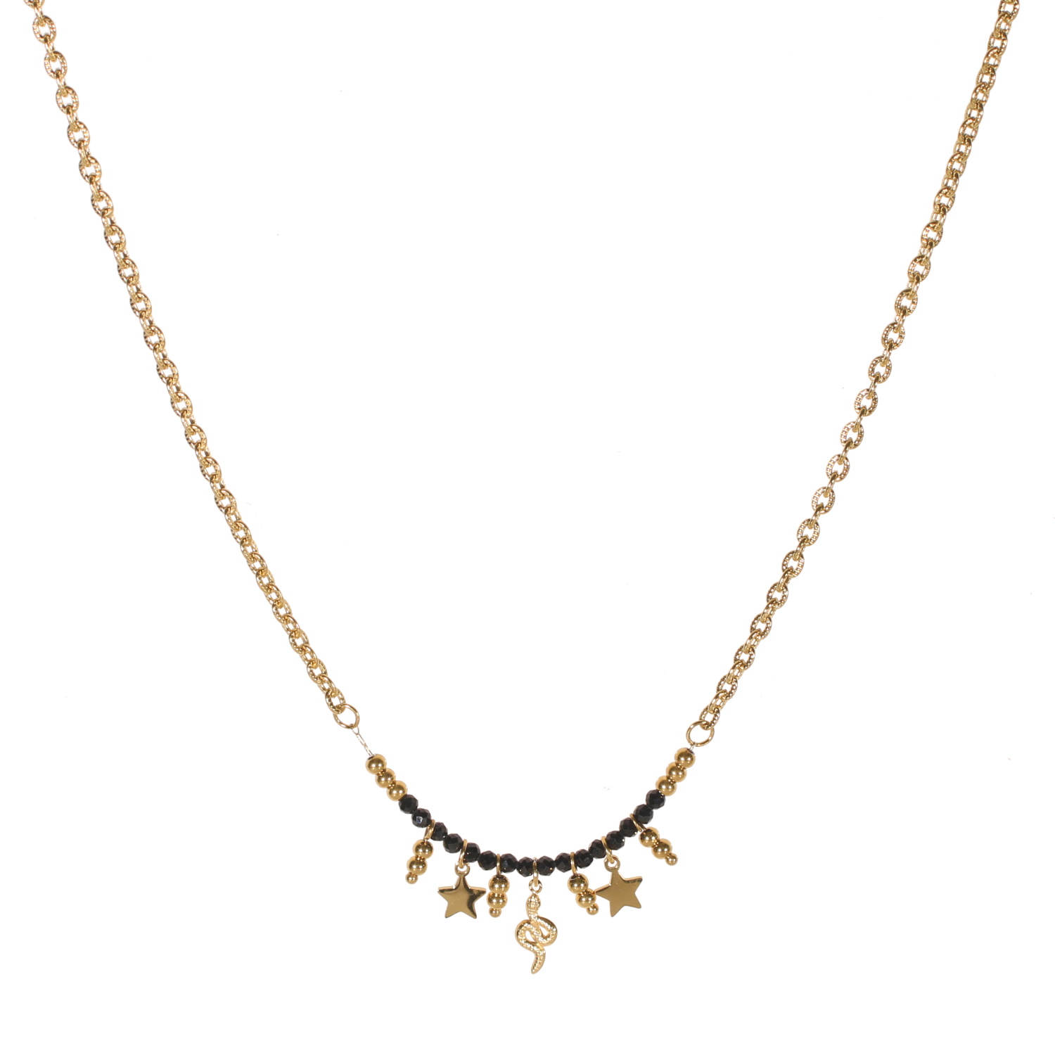 Collier composé d'une chaîne avec pendants étoiles, perles, serpent en acier doré et des perles en véritable pierre d'agate noire.