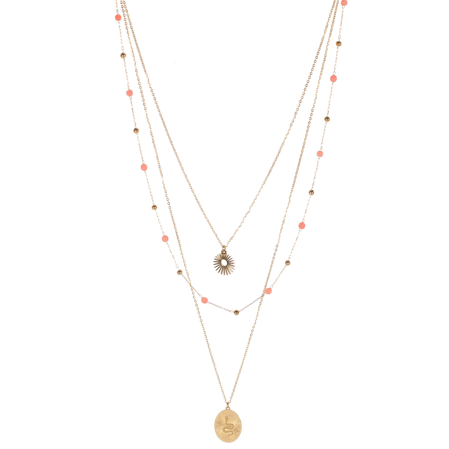 Collier triple rangs composé d'une chaîne 39 cm de long avec pendentif soleil en acier doré, d'une chaîne de 46 cm de long avec perles en acier doré et perles en véritable pierre de quartz rose, ainsi qu'une chaîne de 54 cm de long avec pendentif ovale représentant un serpent en acier doré.