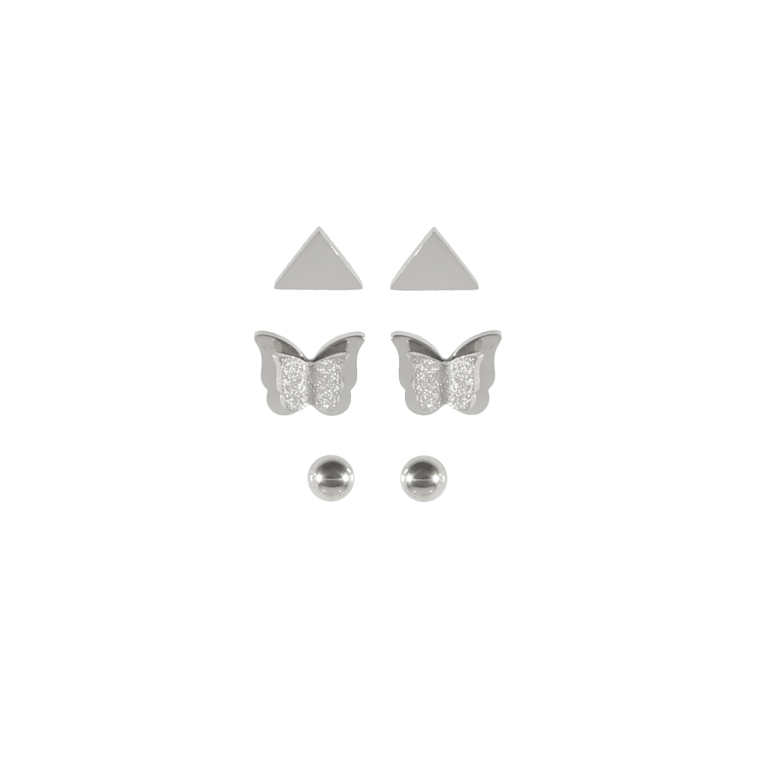 Description Lot de 3 paires de boucles d'oreilles puces en forme de triangle, de boule et de papillon en acier argenté. Largeur 9 mm Matière(s) Acier . L'acier utilisé dans la bijouterie existe sous plusieurs qualités. Nous utilisons principalement la qualité 316L, qualité qui est utilisée en chirurgie. Cet acier est donc inoxydable et reste très résistant. Fermoir Tiges poussettes Couleur(s) dominante(s) Argenté Public Adolescent , Adulte . Genre Femme , Fille . Saison Indémodable . Thème(s) Animaux , Nature . Cliquez sur une matière, un thème, une couleur ou une collection pour voir tous les articles associés.