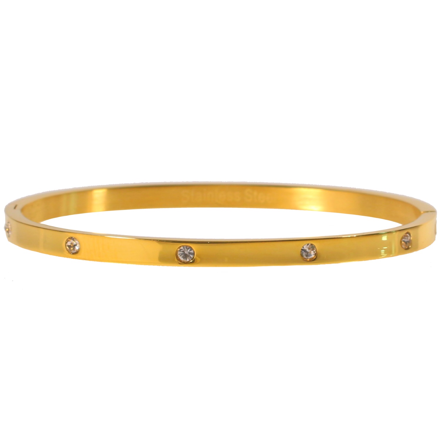 Description Bracelet jonc rigide en acier doré et cristaux synthétiques. Largeur 4 mm Diamètre 60 mm [Guide des tailles] Matière(s) Acier , Verre . L'acier utilisé dans la bijouterie existe sous plusieurs qualités. Nous utilisons principalement la qualité 316L, qualité qui est utilisée en chirurgie. Cet acier est donc inoxydable et reste très résistant. Fermoir Charnière Couleur(s) dominante(s) Doré Public Adolescent , Adulte . Genre Femme , Fille . Saison Indémodable . Cliquez sur une matière, un thème, une couleur ou une collection pour voir tous les articles associés.