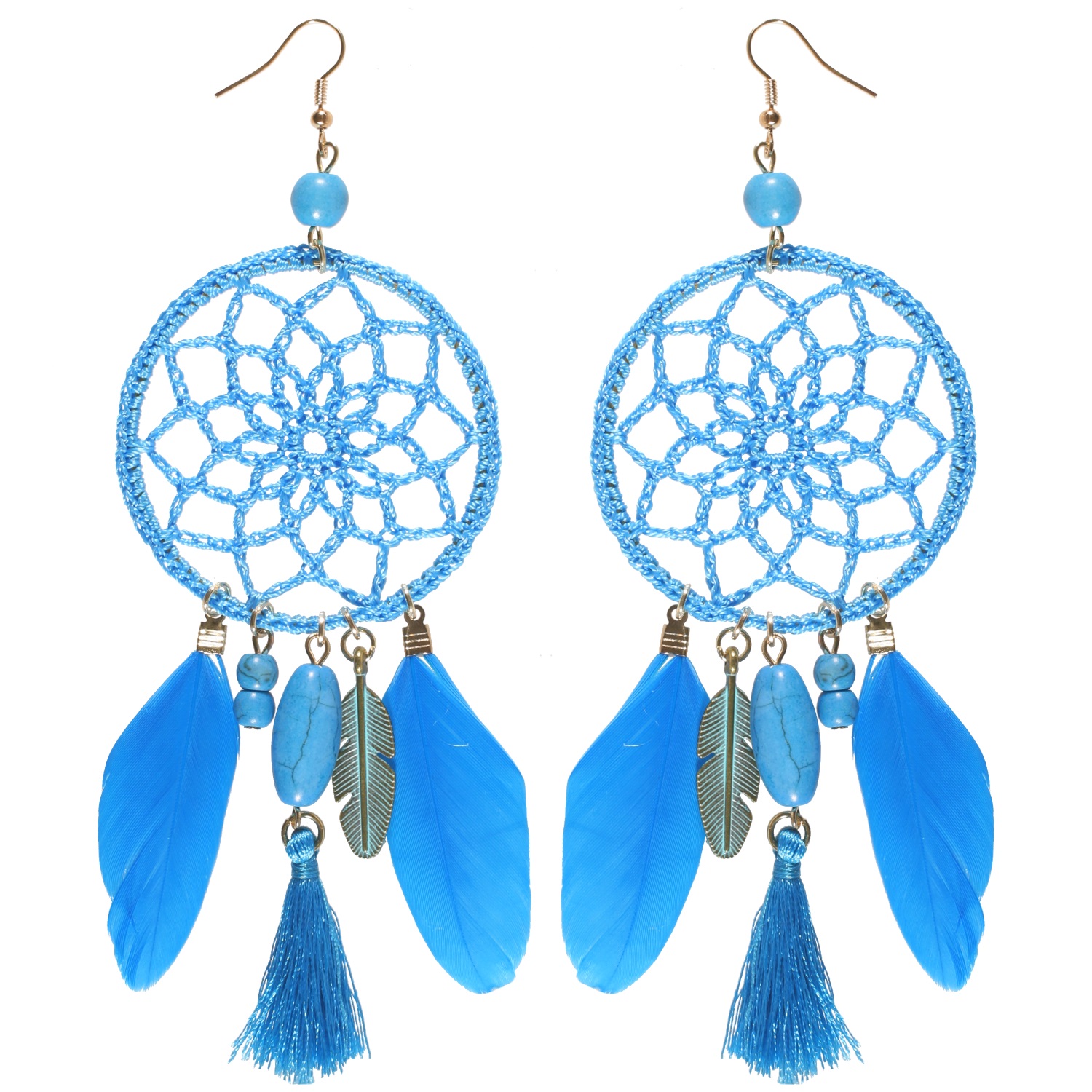 Boucles d'oreilles pendantes attrape-rêve en métal doré, textile, pierres de couleur et plumes.
