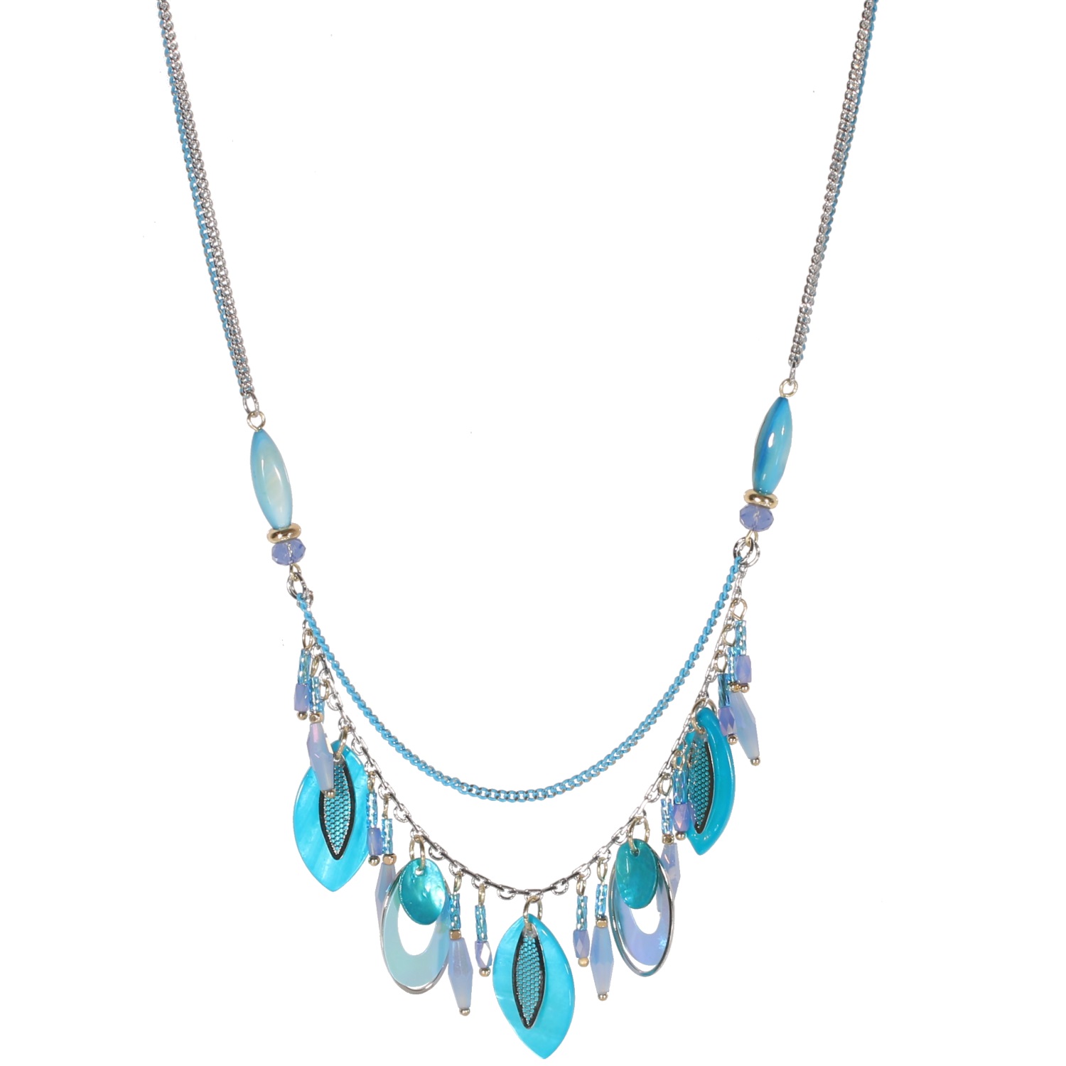 Collier fantaisie double rangs composé d'un collier de 45 cm de long en métal argenté, métal doré, métal peint et perles de couleur ainsi qu'un collier de 46 cm de long en métal argenté, métal doré et pendants feuilles en métal argenté, nacre avec émail, cristaux et pierres de couleur.
