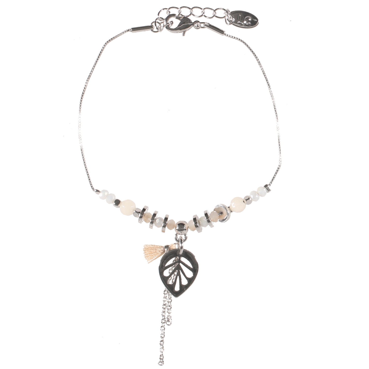 Bracelet fantaisie avec breloques feuille et chaînettes en métal argenté, perles de couleur et pompon en textile.