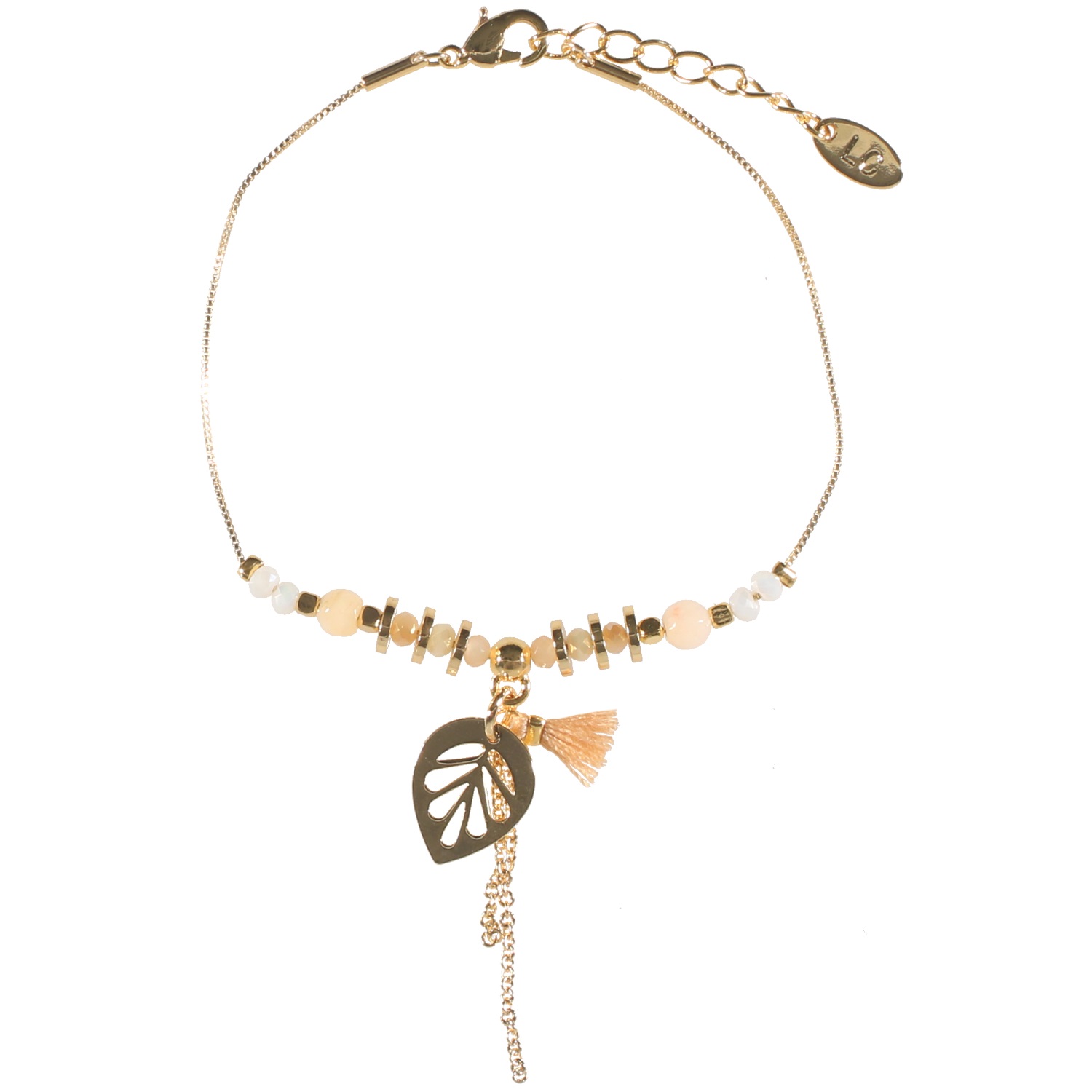 Bracelet fantaisie avec breloques feuille et chaînettes en métal doré, perles de couleur et pompon en textile.
