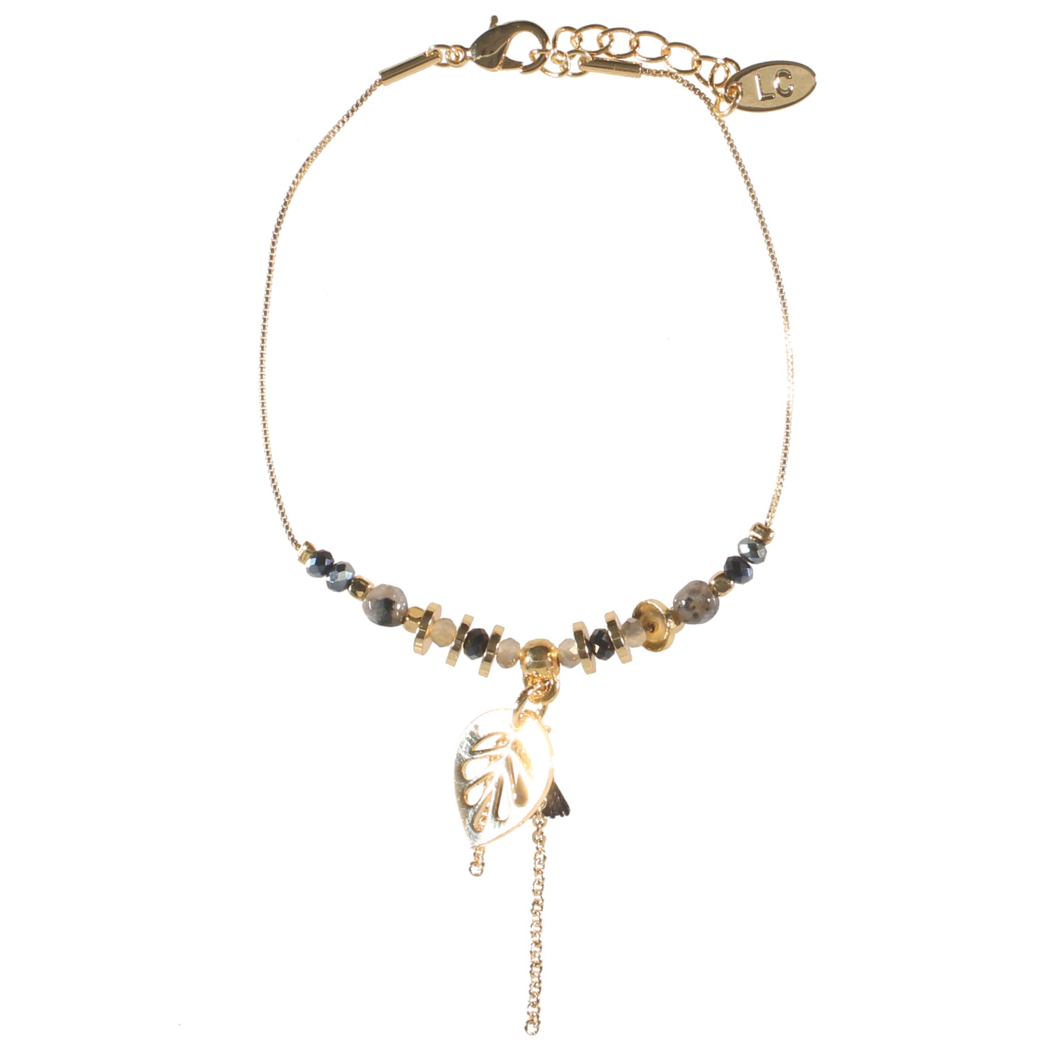 Bracelet fantaisie avec breloques feuille et chaînettes en métal doré, perles de couleur et pompon en textile.