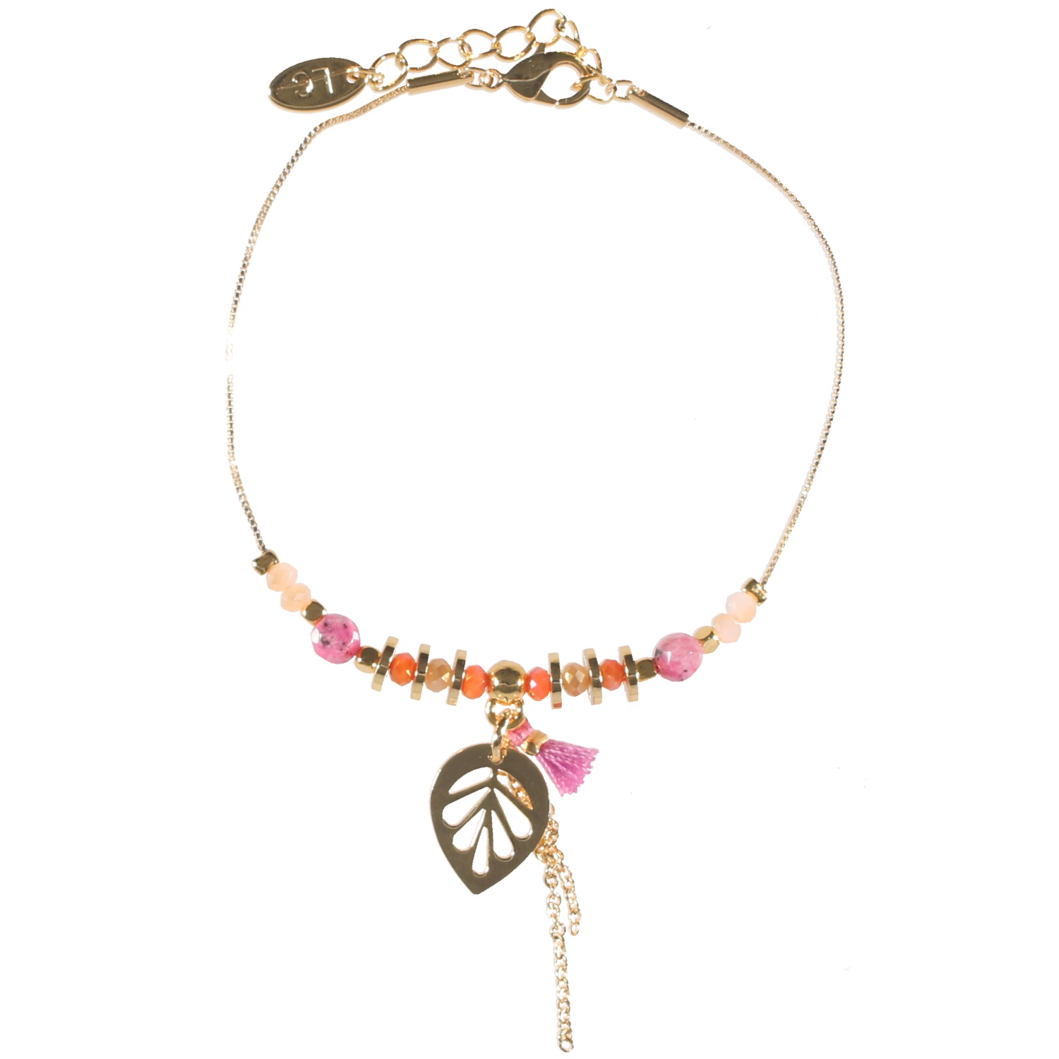 Bracelet fantaisie avec breloques feuille et chaînettes en métal doré, perles de couleur et pompon en textile.