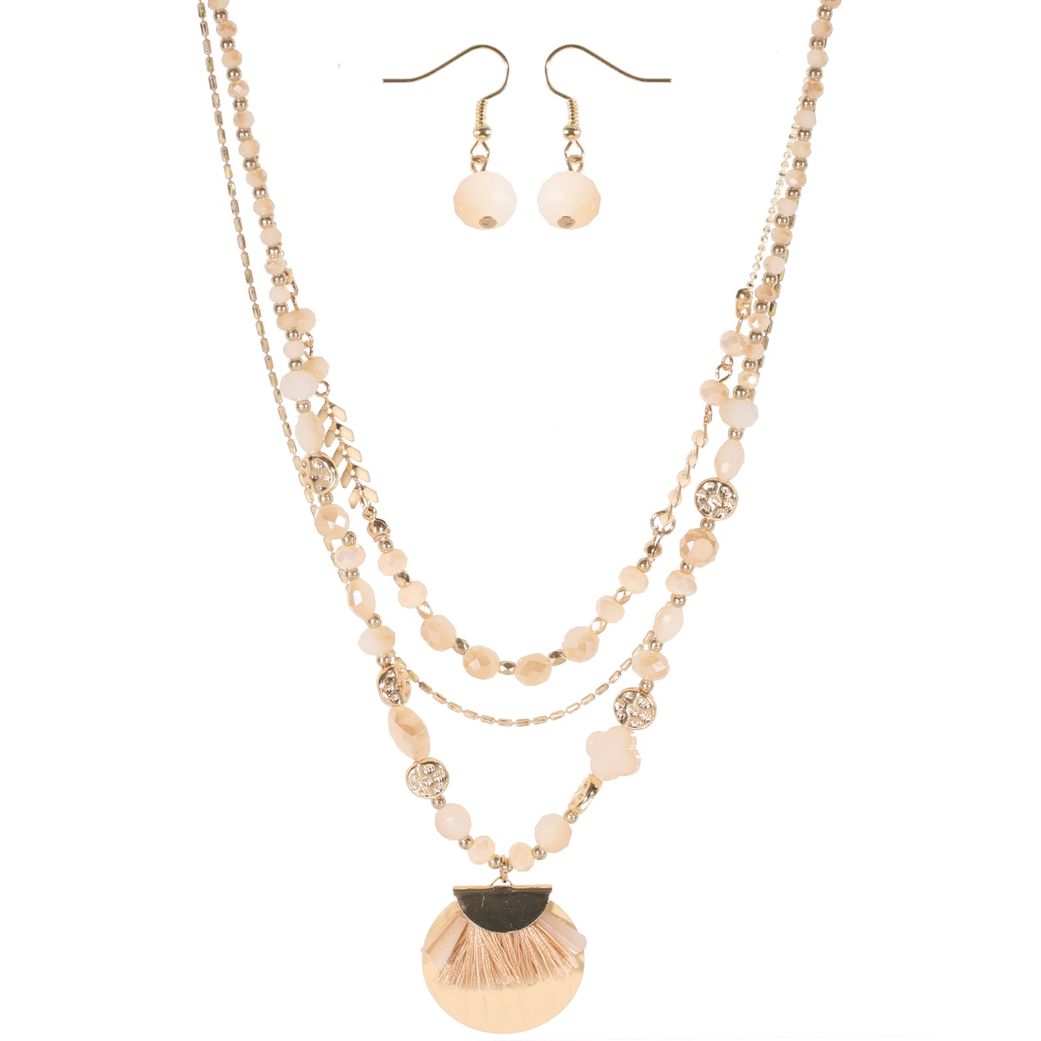 Parure fantaisie composée d'un collier triple rangs avec un collier de 44 cm de long en métal doré, métal peint, perles de couleur et feuilles de laurier en émail, un collier de 46 cm de long en métal doré et métal peint et un collier de 50 cm de long en métal doré, perles de couleur et pendant en métal doré, pastilles en métal peint, pierres de couleur et franges en textile ainsi qu'une paire de boucles d'oreilles en métal doré et perles de couleur.