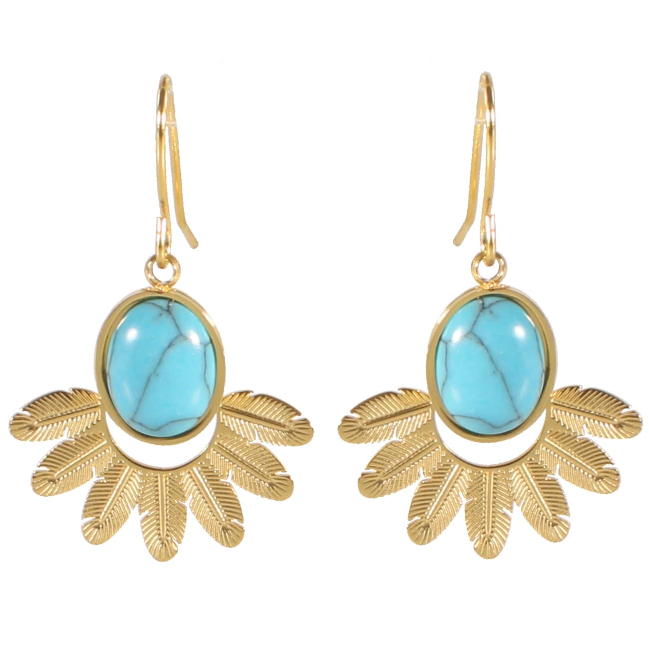 Description Boucles d'oreilles pendantes avec plumes en acier doré et pierres d'imitation turquoise. Cliquez sur une matière, un thème, une couleur ou une collection pour voir tous les articles associés.