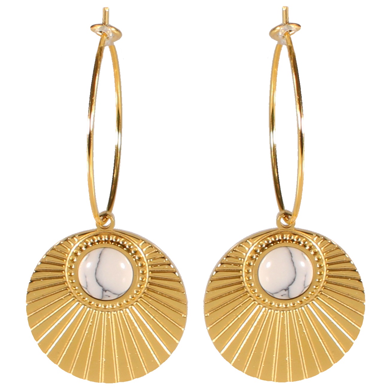 Description Boucles d'oreilles créoles avec pastilles rondes pendantes aux motifs de rayons solaires en acier doré surmontées de pierres de couleur blanche. Largeur 18 mm Hauteur 40 mm Diamètre 20 mm Matière(s) Acier , Rocaille . L'acier utilisé dans la bijouterie existe sous plusieurs qualités. Nous utilisons principalement la qualité 316L, qualité qui est utilisée en chirurgie. Cet acier est donc inoxydable et reste très résistant. Fermoir Autre Couleur(s) dominante(s) Blanc , Doré Public Adolescent , Adulte . Genre Femme , Fille . Saison Indémodable . Collection Navajo Cliquez sur une matière, un thème, une couleur ou une collection pour voir tous les articles associés.