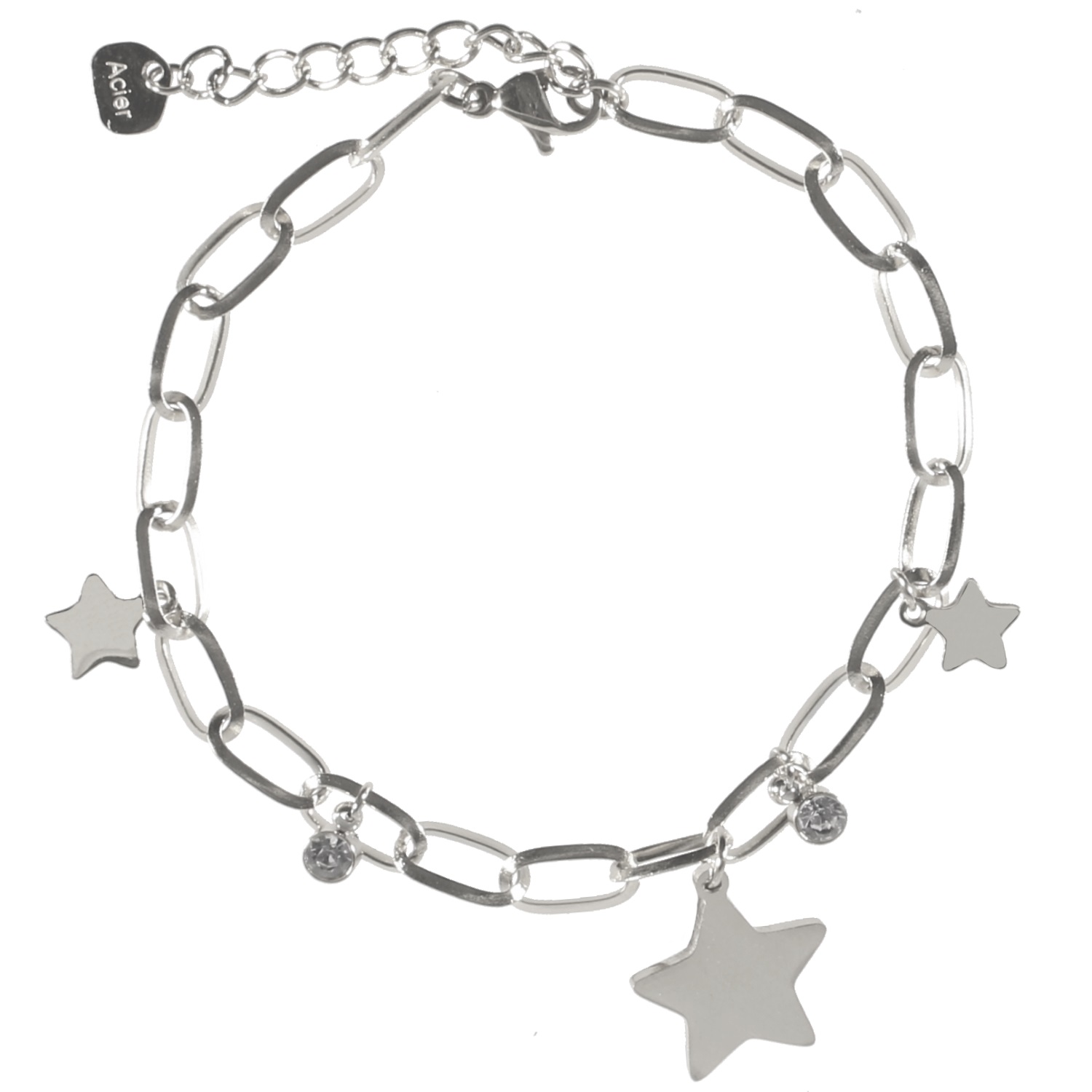 Description Bracelet composé d'une chaîne maille cheval et trois étoiles pendantes en acier argenté et deux pampilles avec cristaux sertis clos. Fermoir mousqueton avec 2.5 cm de rallonge. Longueur 16+2.5 cm [Guide des tailles] Largeur 15 mm Matière(s) Acier , Verre . L'acier utilisé dans la bijouterie existe sous plusieurs qualités. Nous utilisons principalement la qualité 316L, qualité qui est utilisée en chirurgie. Cet acier est donc inoxydable et reste très résistant. Fermoir Mousqueton Couleur(s) dominante(s) Argenté Public Adolescent , Adulte . Genre Femme , Fille . Saison Indémodable . Thème(s) Nature . Cliquez sur une matière, un thème, une couleur ou une collection pour voir tous les articles associés.