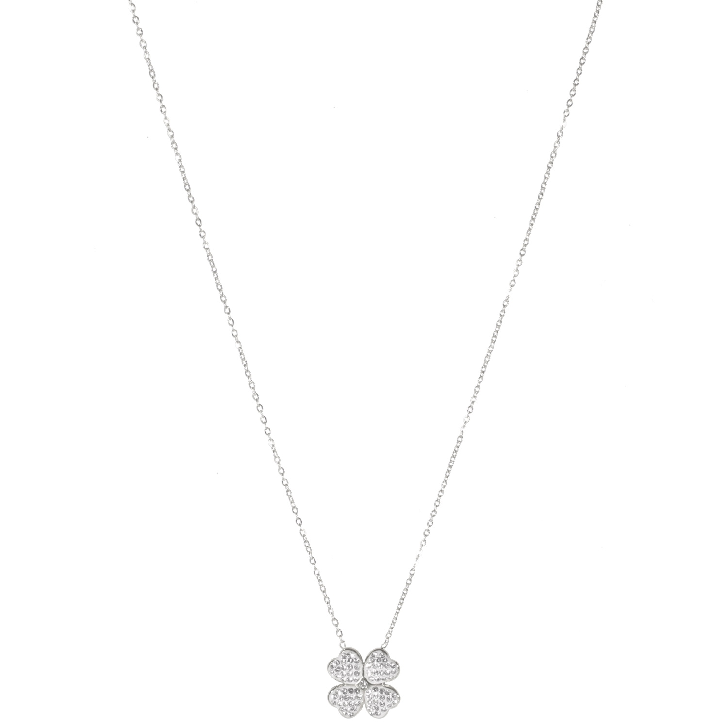 Collier composé d'une chaîne en acier argenté et d'un pendentif trèfle à quatre feuilles pavé de strass.