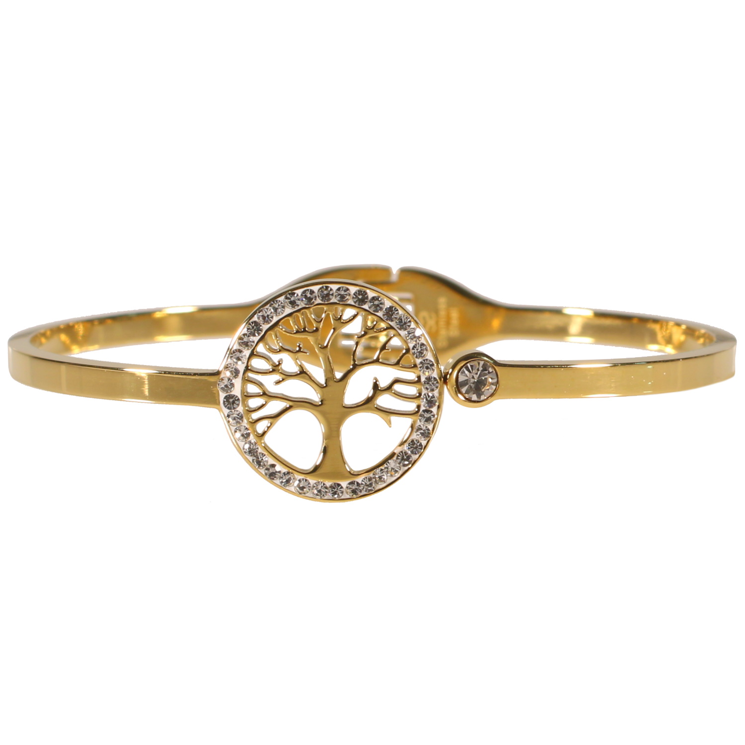 Bracelet jonc rigide en acier doré avec le motif d'arbre de vie ajouré encerclé d'un pavage de strass.