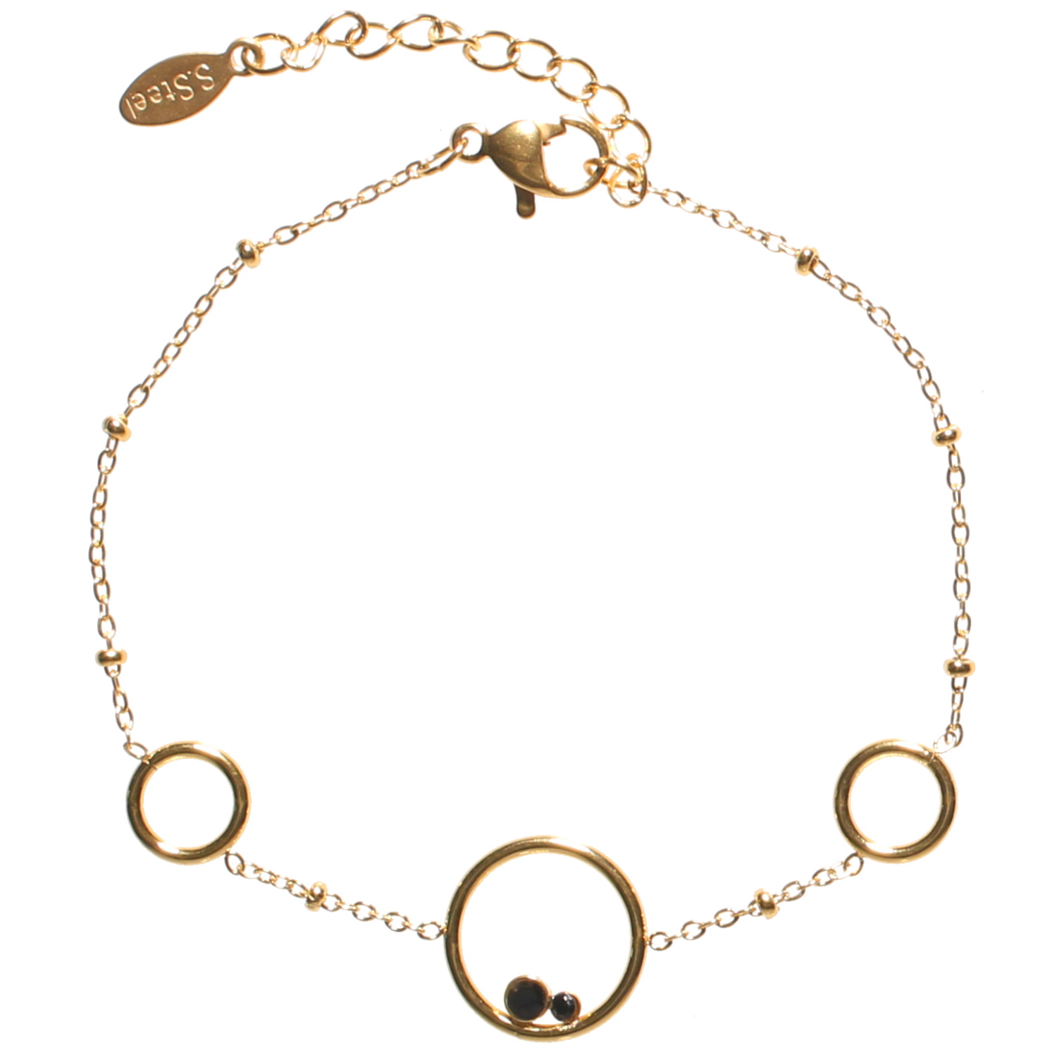 Description Bracelet composé d'une chaîne avec trois cercles en acier doré et de deux cristaux de couleur noir sertis clos. Fermoir mousqueton avec 3 cm de rallonge. Longueur 16+3 cm [Guide des tailles] Largeur 13 mm Matière(s) Acier , Verre . L'acier utilisé dans la bijouterie existe sous plusieurs qualités. Nous utilisons principalement la qualité 316L, qualité qui est utilisée en chirurgie. Cet acier est donc inoxydable et reste très résistant. Fermoir Mousqueton Couleur(s) dominante(s) Doré , Noir Public Adolescent , Adulte . Genre Femme , Fille . Saison Indémodable . Cliquez sur une matière, un thème, une couleur ou une collection pour voir tous les articles associés.