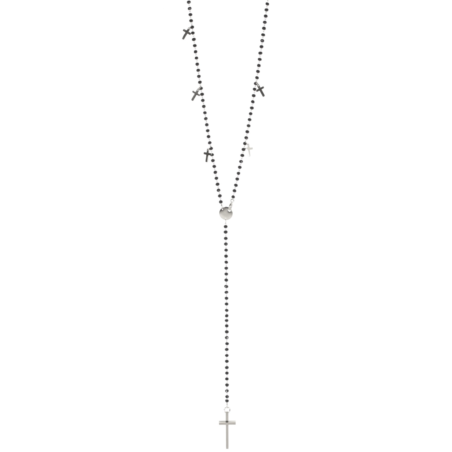 Collier sautoir chapelet forme Y avec croix et pastille ronde en acier argenté et perles de couleur noire.