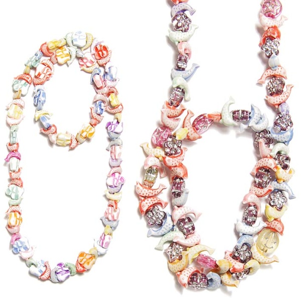 Parure fantaisie pour enfants composée d'un collier et d'un bracelet en plastique coloré.