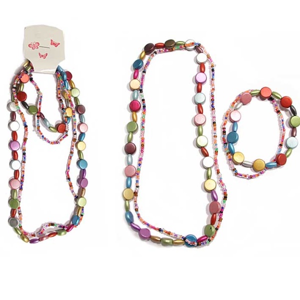 Parure fantaisie en plastique de couleur composée d'un collier et d'un bracelet assortis.