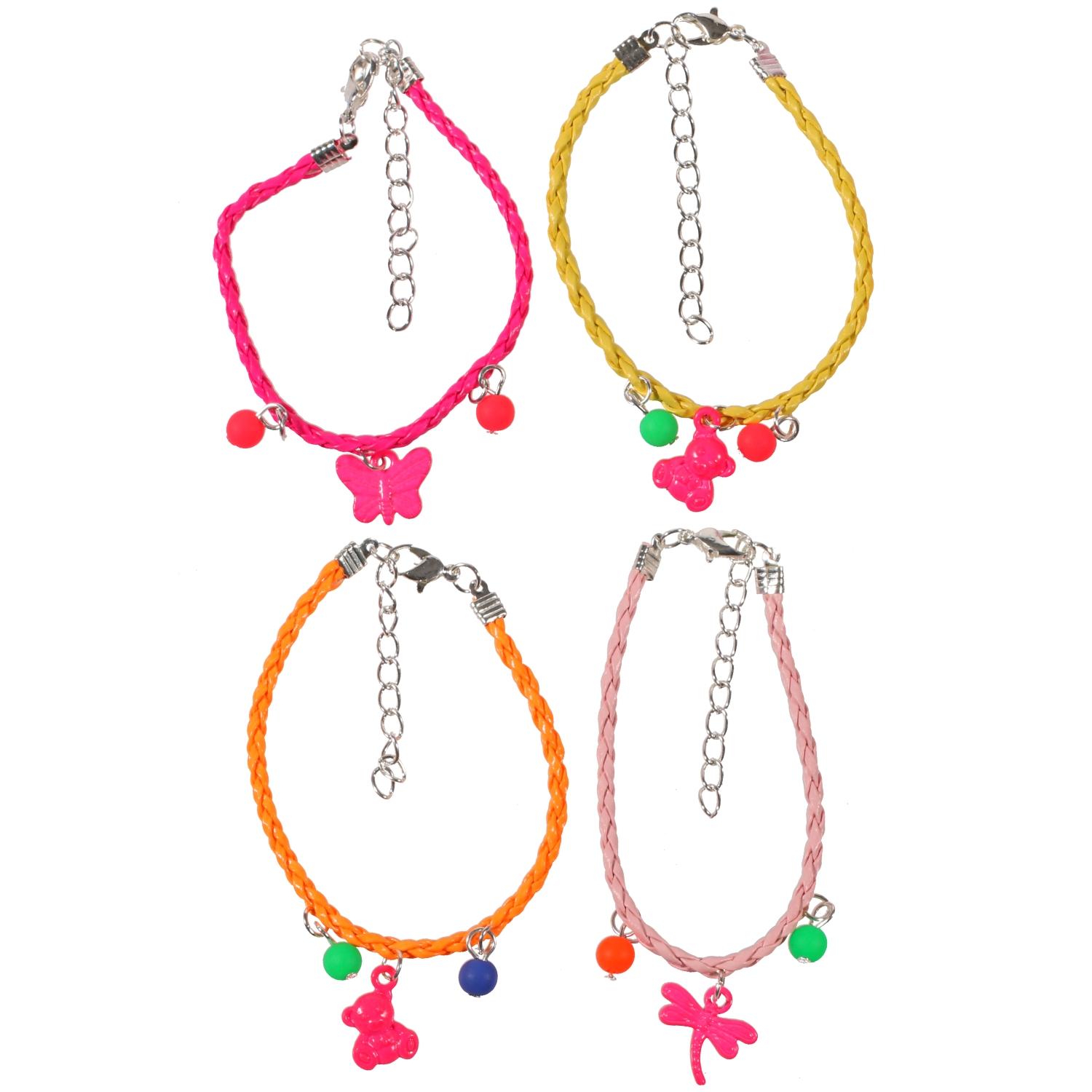 Bracelet fantaisie en coton, métal peint, métal argenté et plastique.
