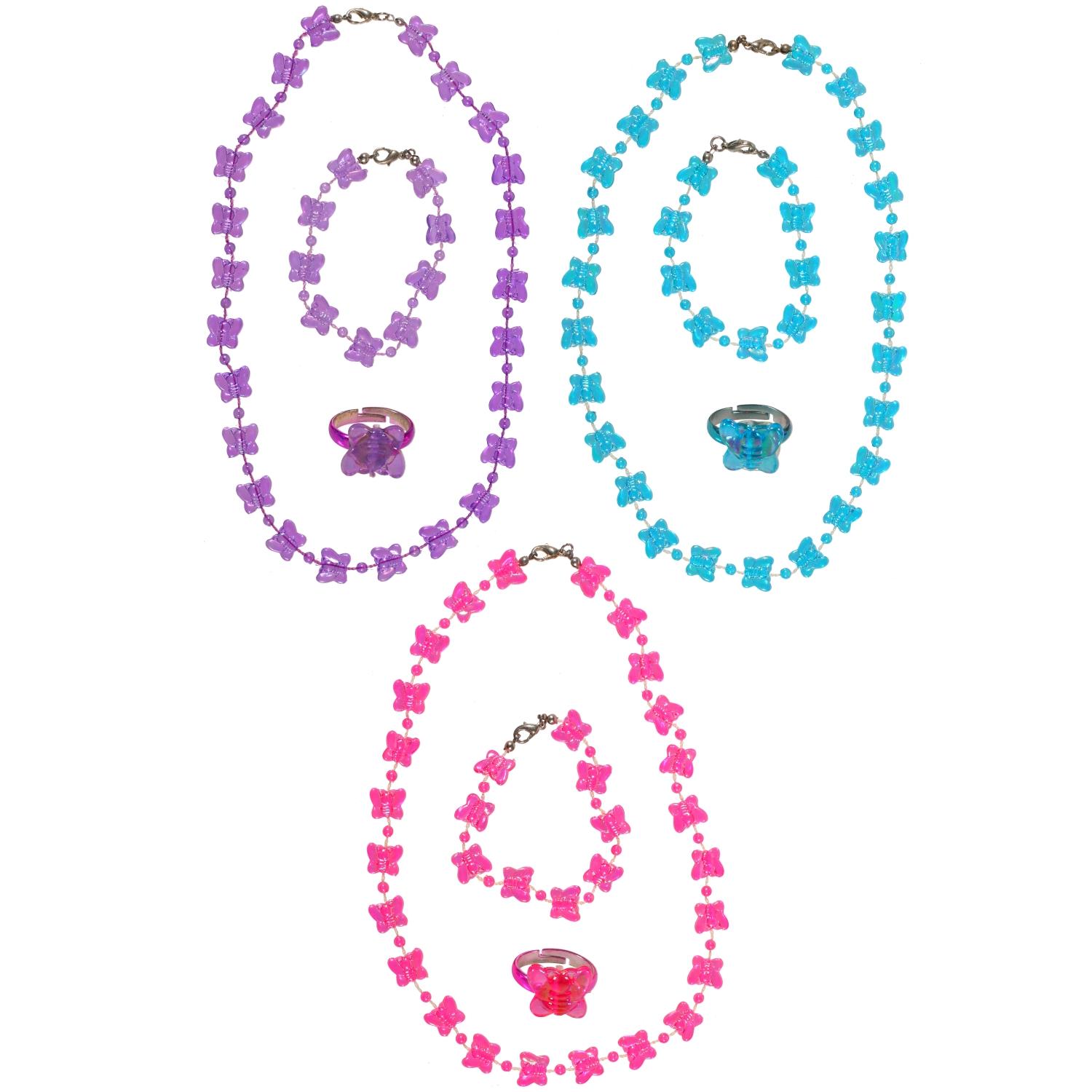 Parure composée d'un collier, un bracelet et d'une bague en plastique et textile.