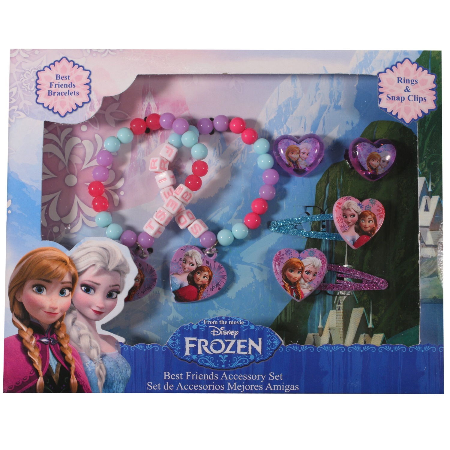 Parure Reine des Neiges comprenant 2 bracelets, 2 bagues et deux clic-clacs.