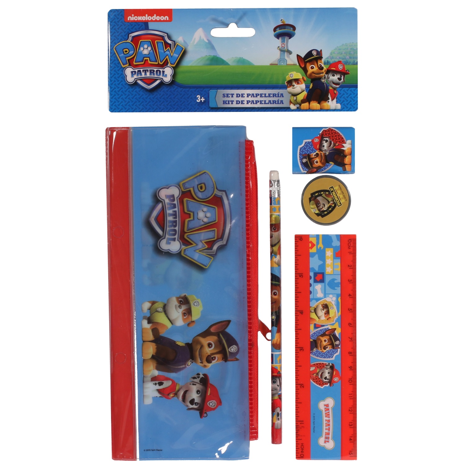 Set de papeterie Pat Patrouille (Paw Patrol) comprenant 1 trousse, 1 crayon à papier, 1 taille crayon, 1 gomme et 1 règle.