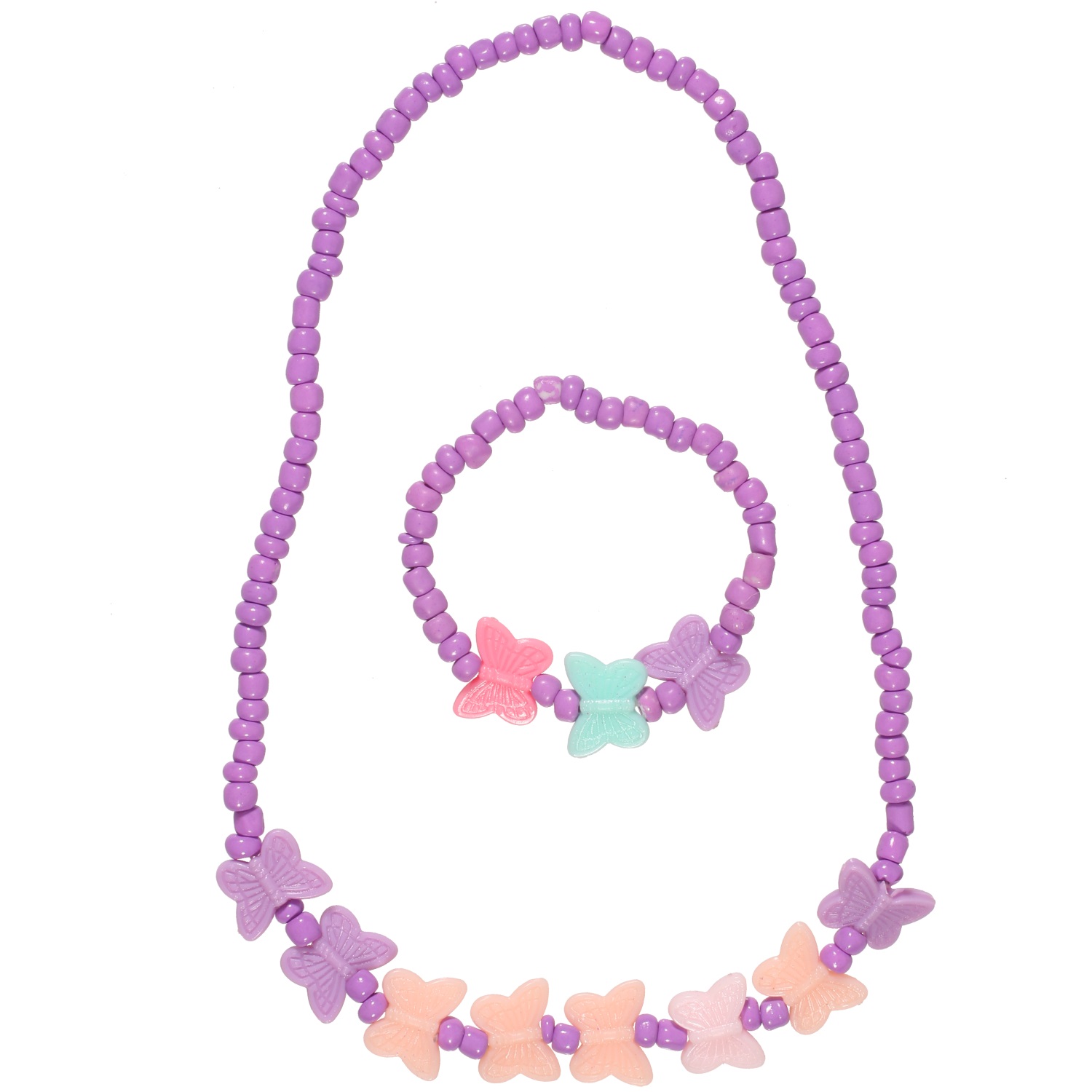 Parure fantaisie Papillons pour enfant composée d'un collier et d'un bracelet élastiques en plastique et rocaille.