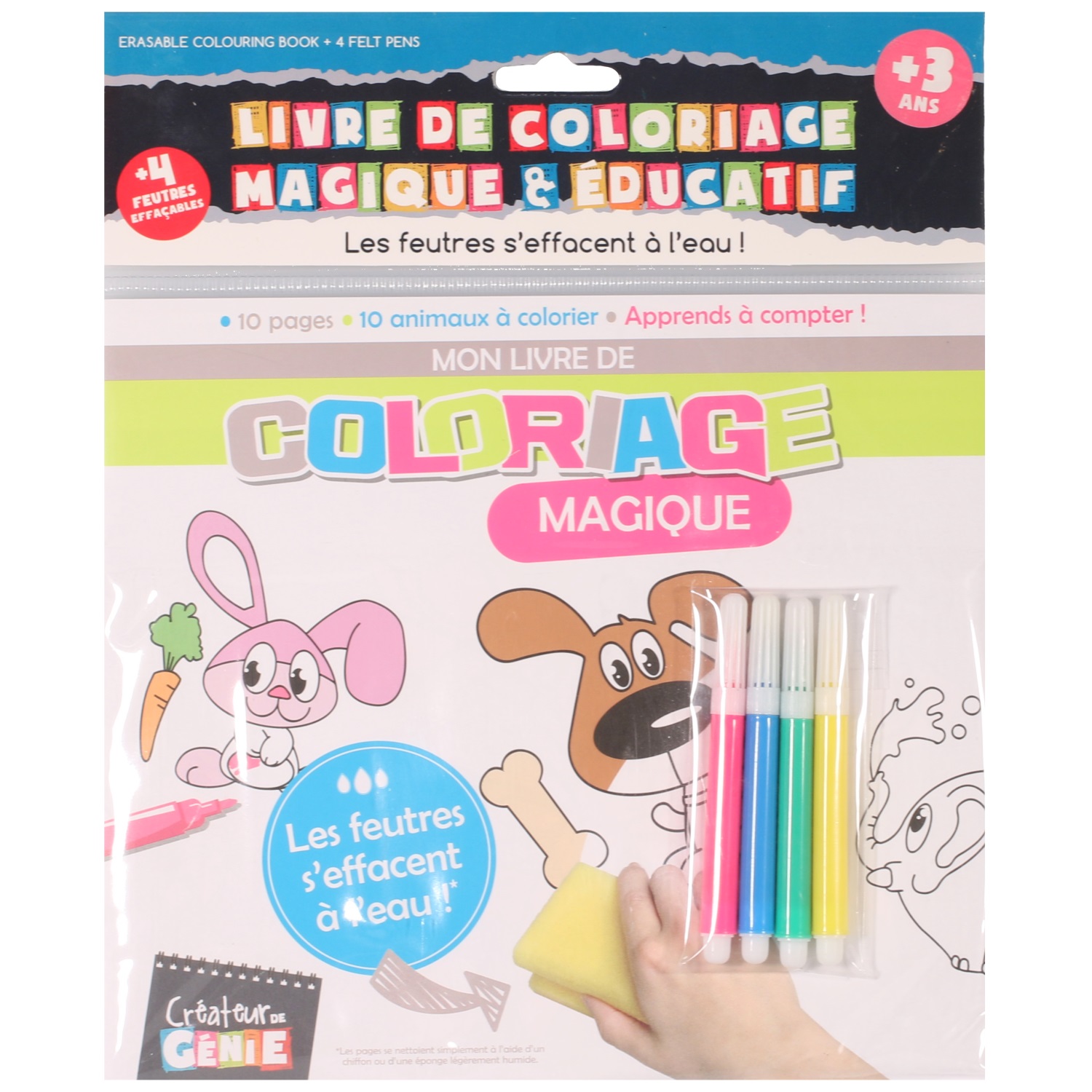 Livre de coloriage magique et éducatif contenant 10 pages d'animaux à colorier et 4 feutres effaçables à l'eau.
