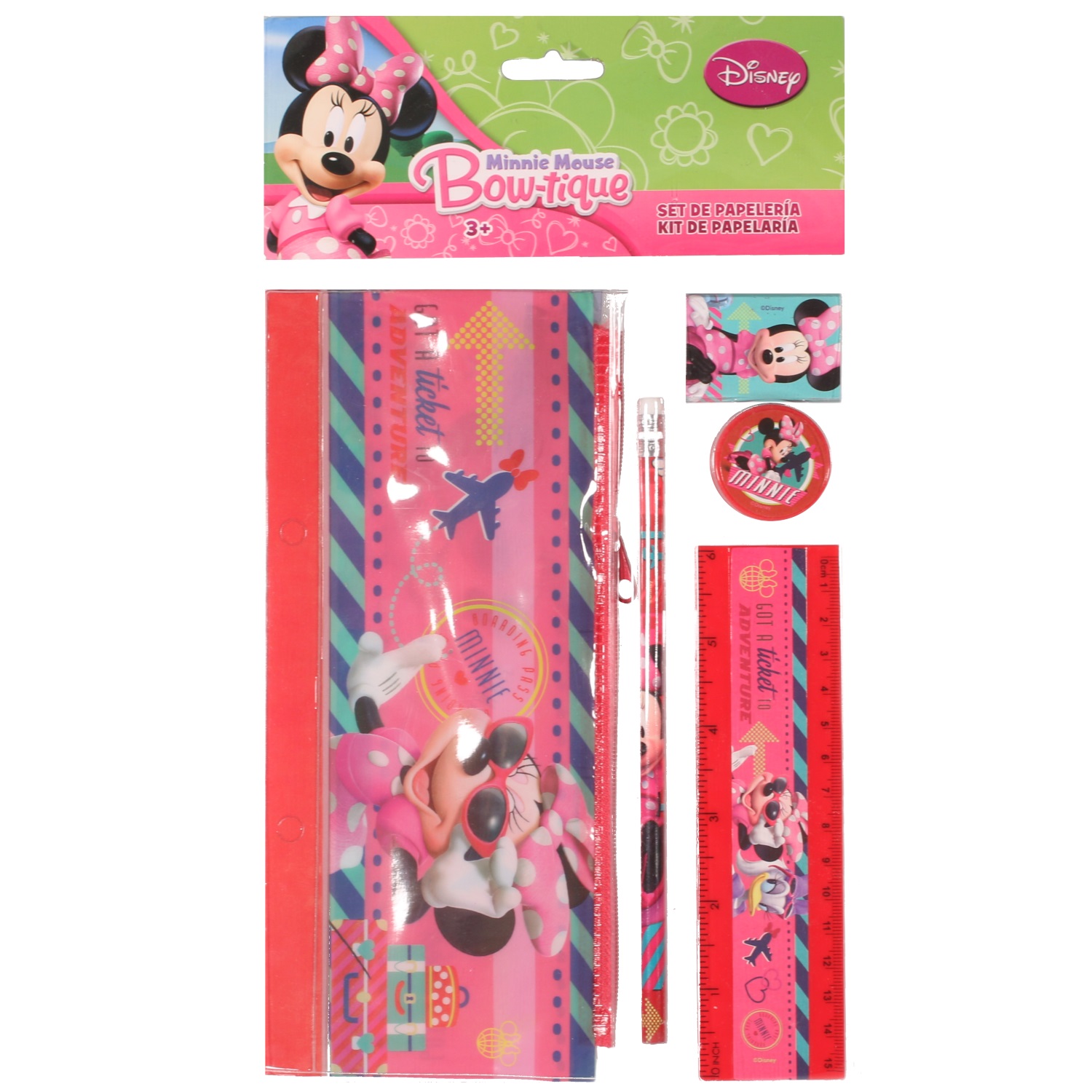 Set papeterie Minnie composé d'une règle (15 cm), 1 crayon à papier avec gomme, 1 taille crayon, 1 gomme et 1 trousse.