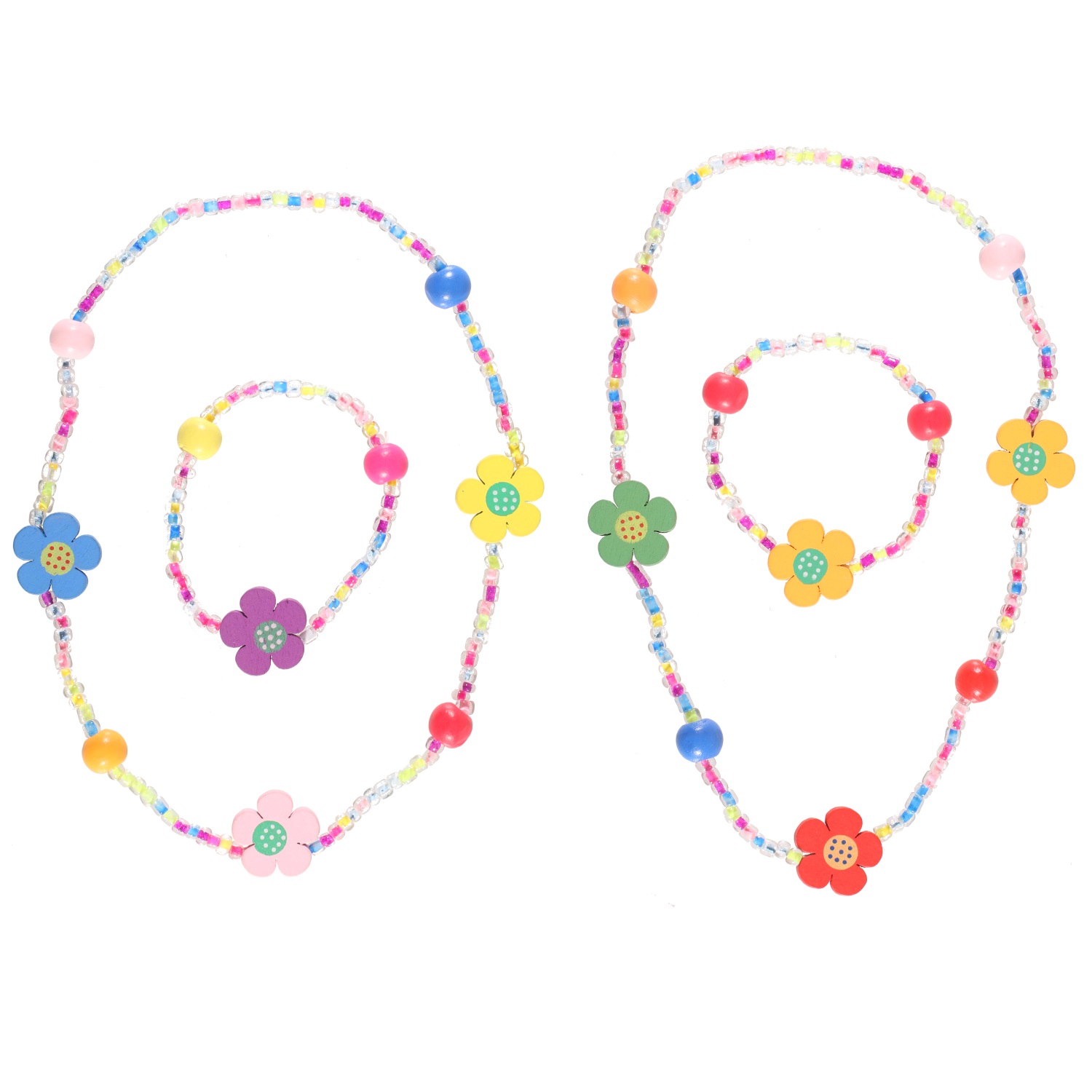 Parure fantaisie pour enfant composée d'un collier et d'un bracelet élastique en plastique de couleur et fleurs et perles en bois.