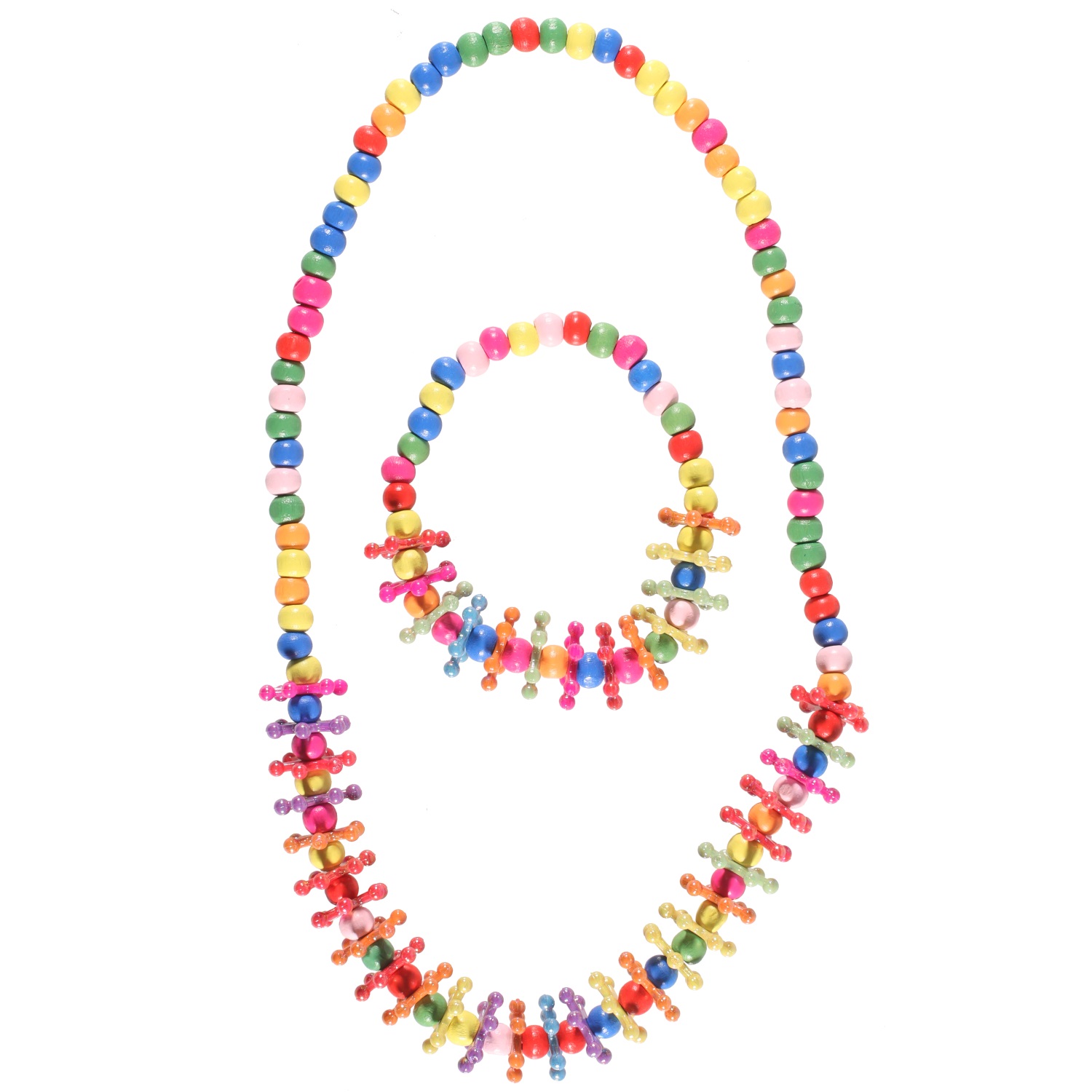 Parure fantaisie pour enfant composée d'un collier et d'un bracelet élastique en perles en bois de couleur et étoiles en plastique.
