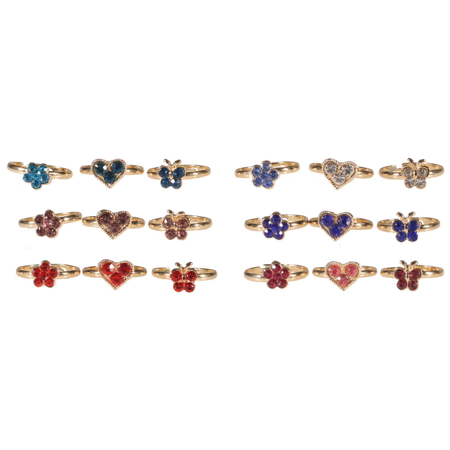 Lot de 3 bagues fantaisie pour enfant en métal doré et cristaux synthétiques.