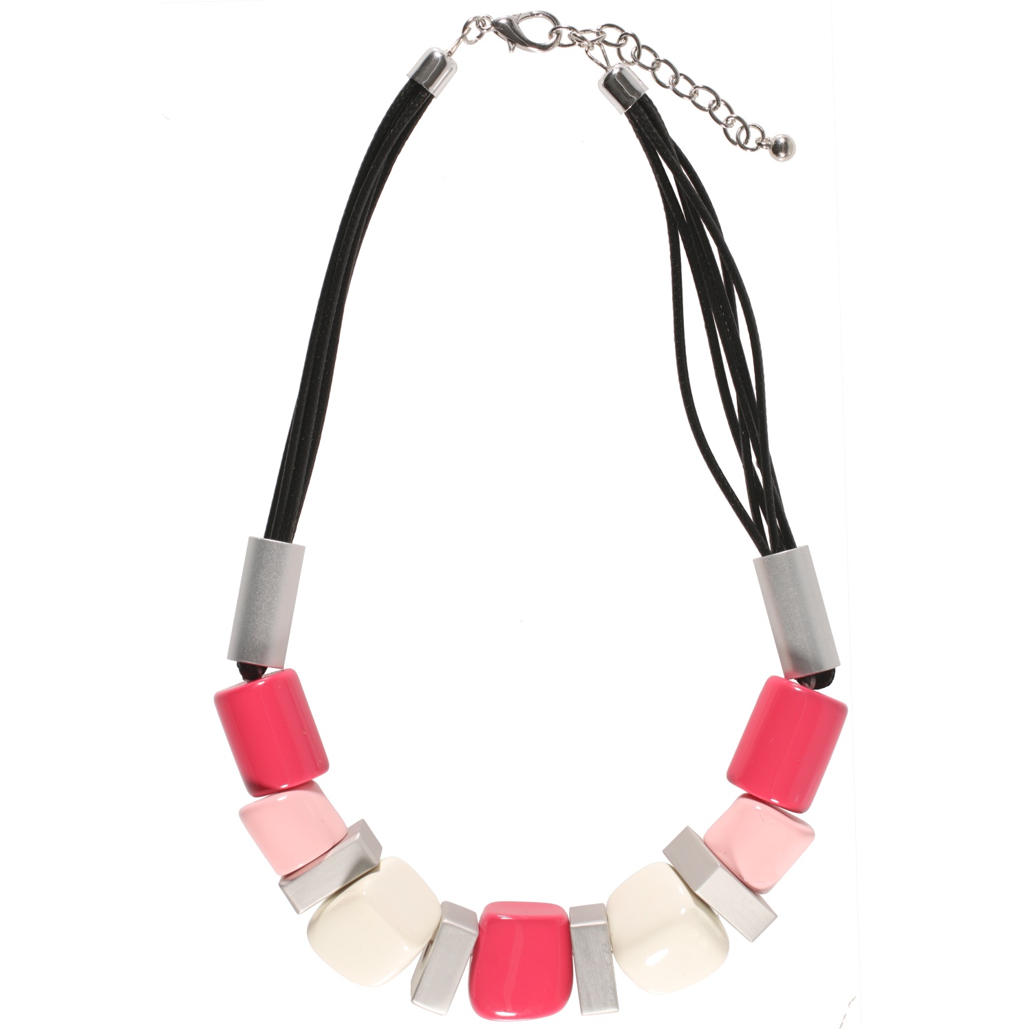 Collier fantaisie multi rangs en métal argenté, cordons en coton ciré et perles cubes, carrés et cylindriques en métal argenté et plastique.