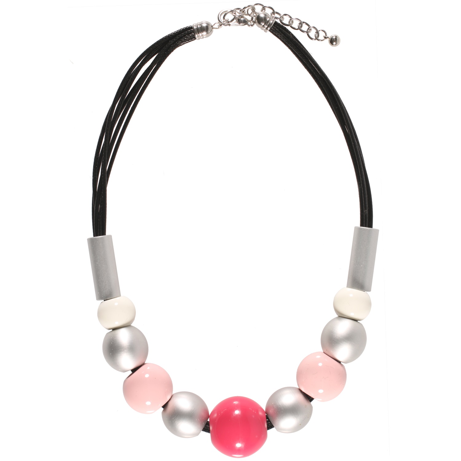 Collier fantaisie multi rangs en métal argenté, cordons en coton ciré et perles rondes en métal argenté et plastique.