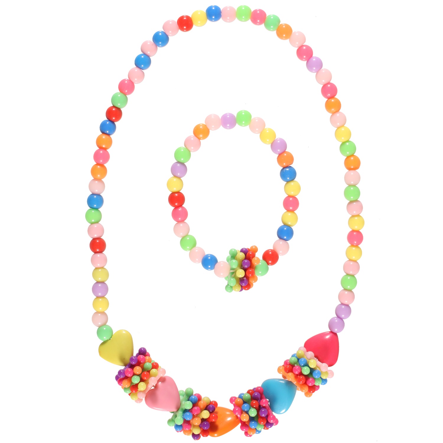 Parure fantaisie pour enfant composée d'un collier et d'un bracelet élastiques avec perles et cœurs en plastique.