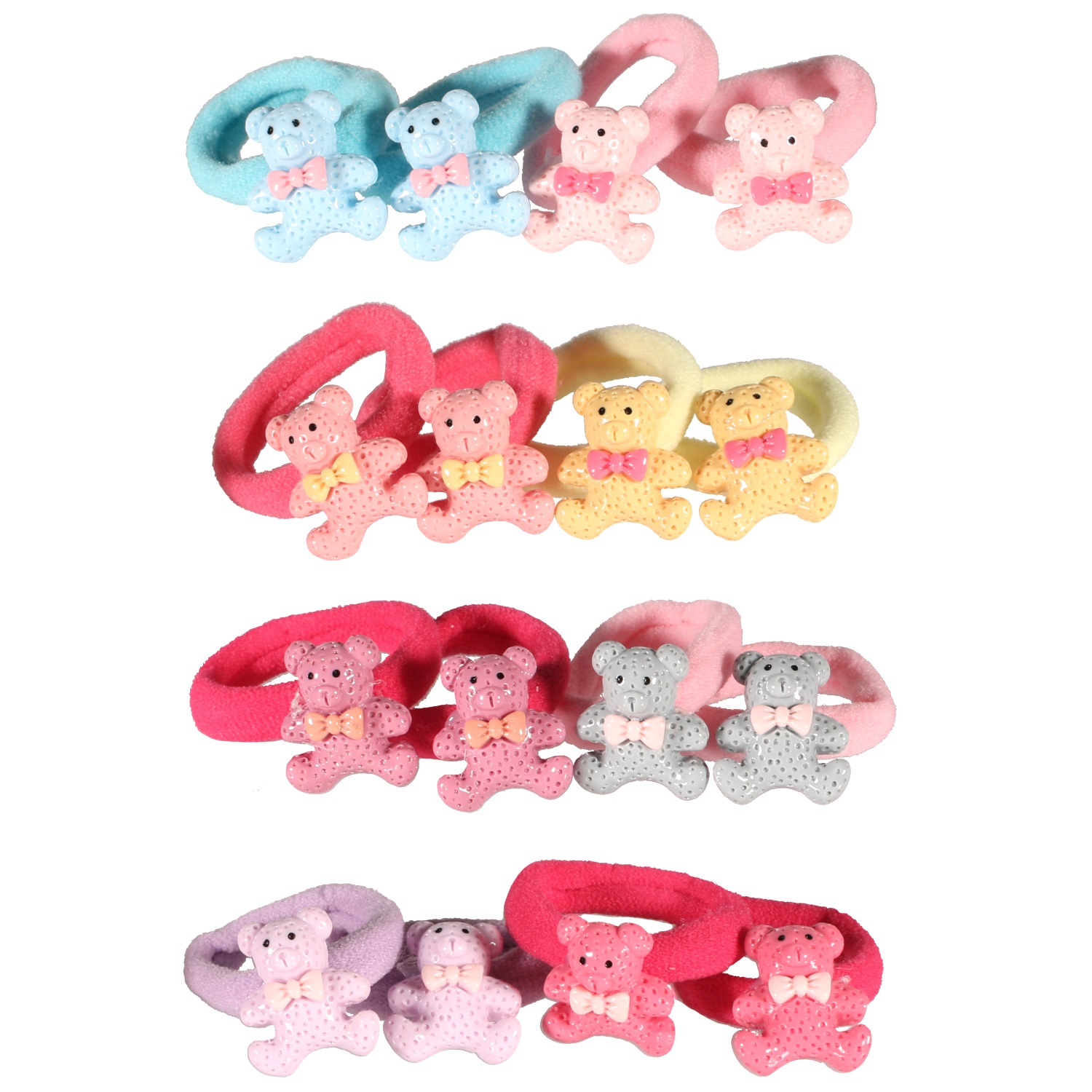 Lot de 4 élastiques cheveux pour enfants en textile et nounours en plastique de couleur.