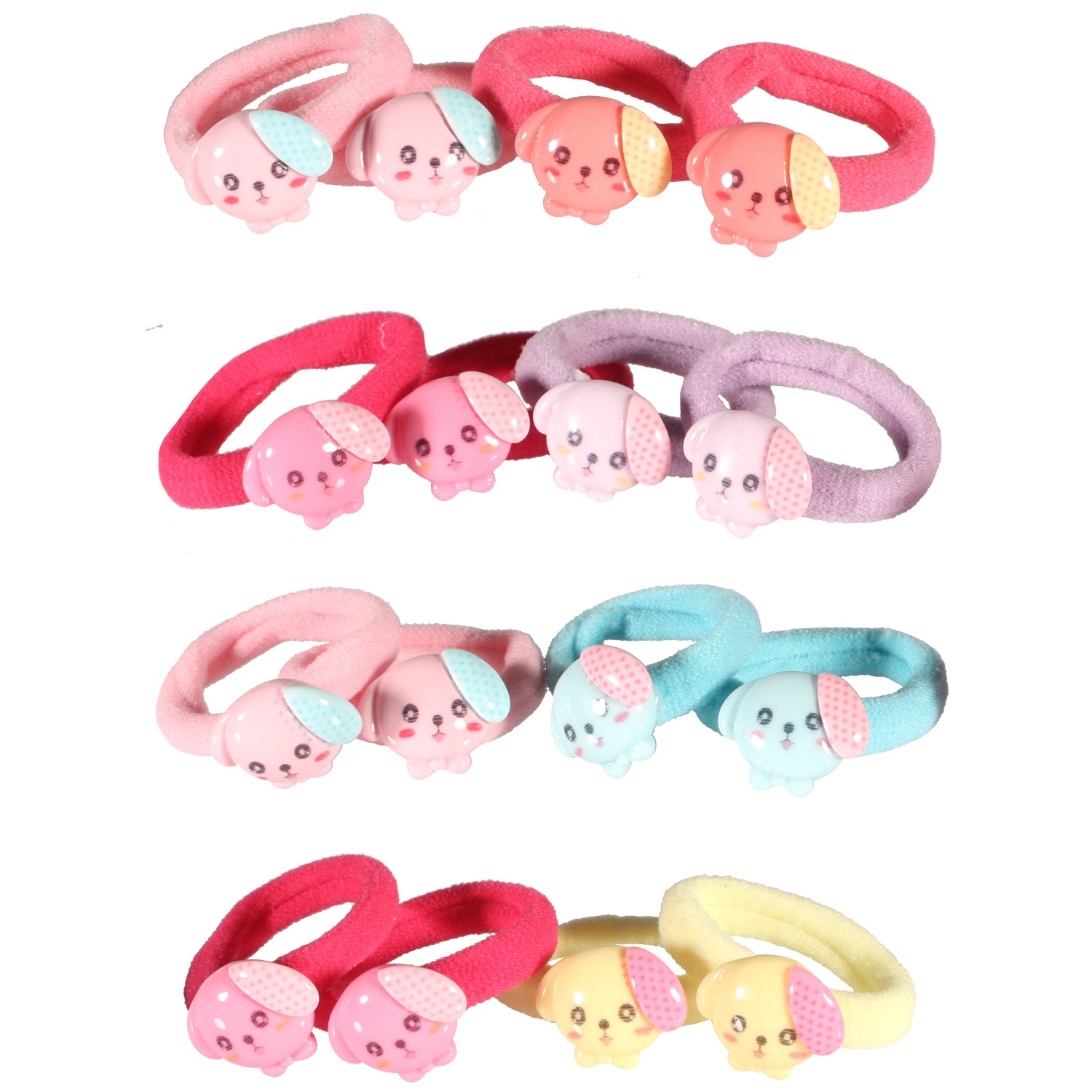 Lot de 4 élastiques cheveux pour enfants en textile et tête de chiot en plastique de couleur.