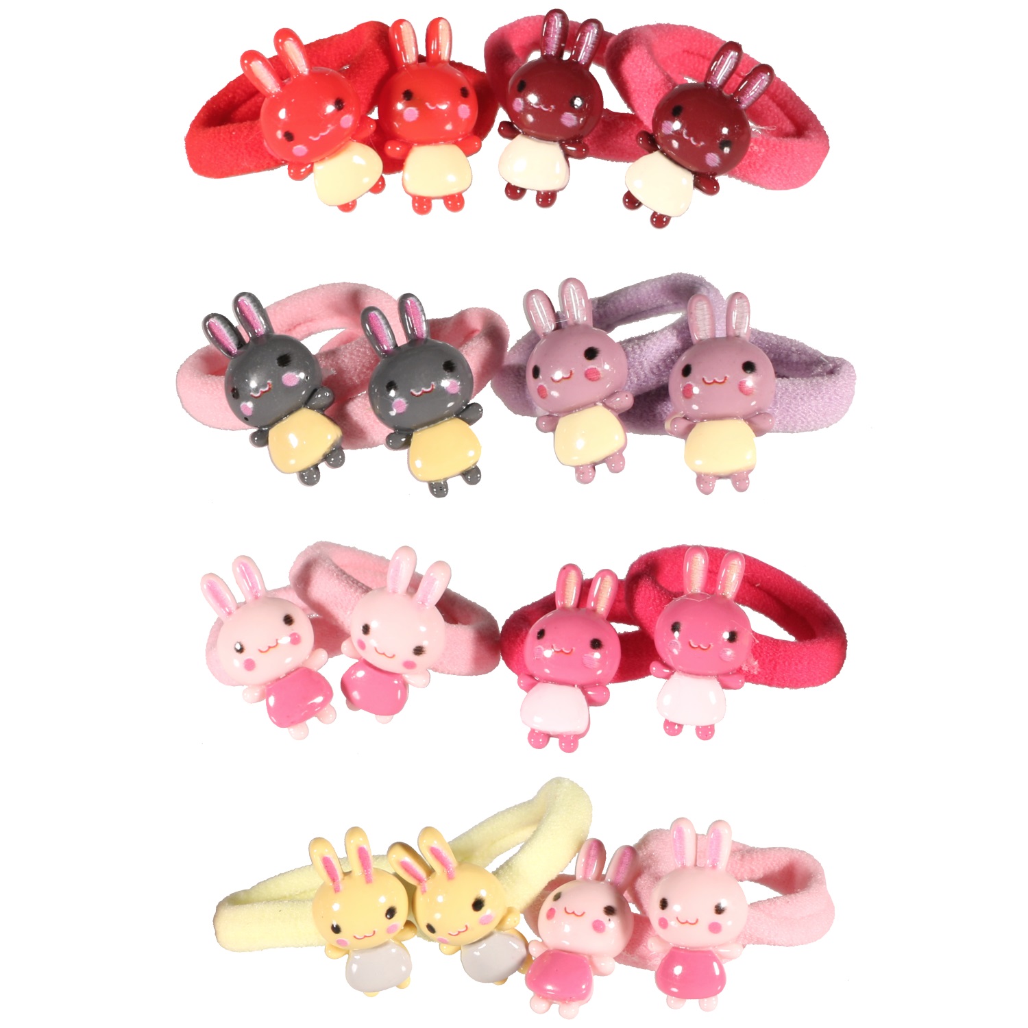Lot de 4 élastiques cheveux pour enfants en textile et lapin en plastique de couleur.