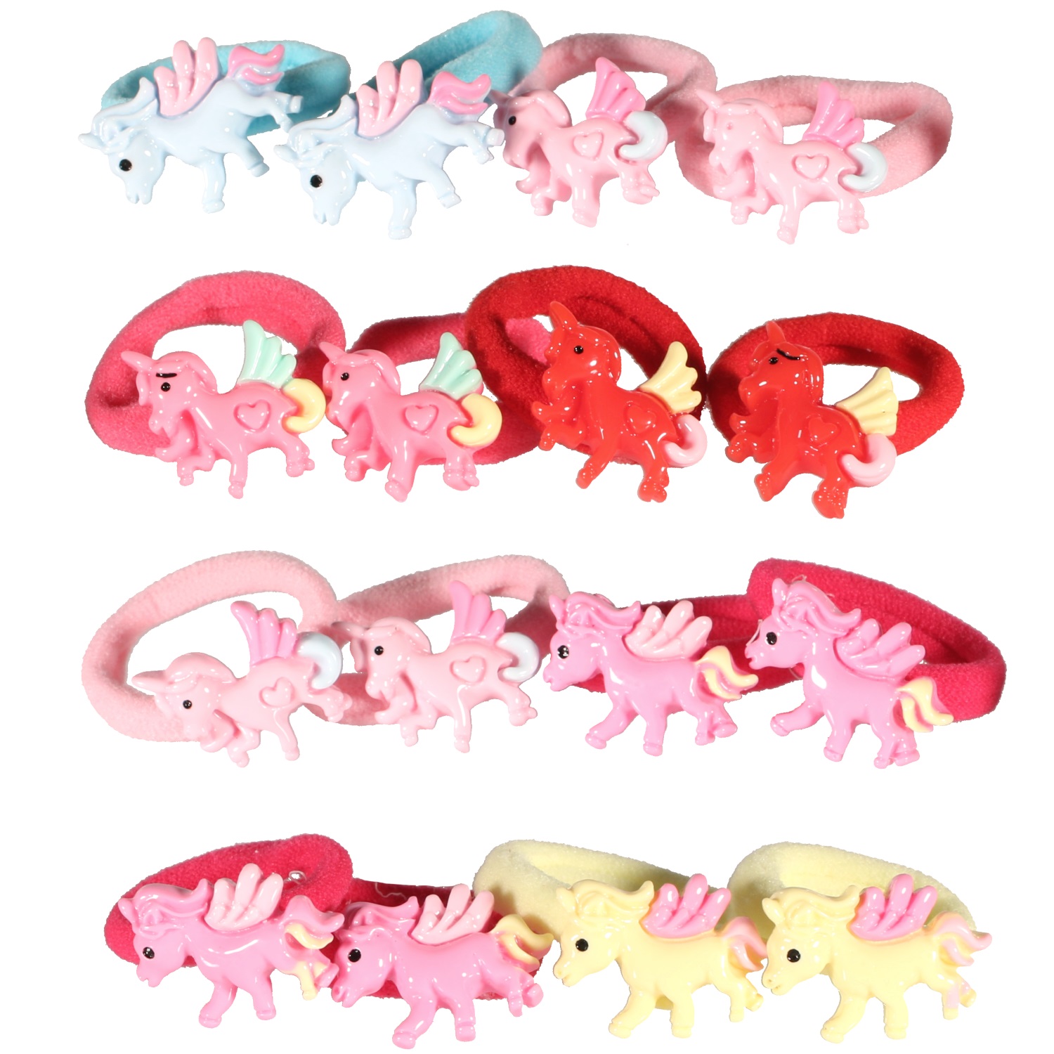 Lot de 4 élastiques cheveux pour enfants en textile et licorne en plastique de couleur.