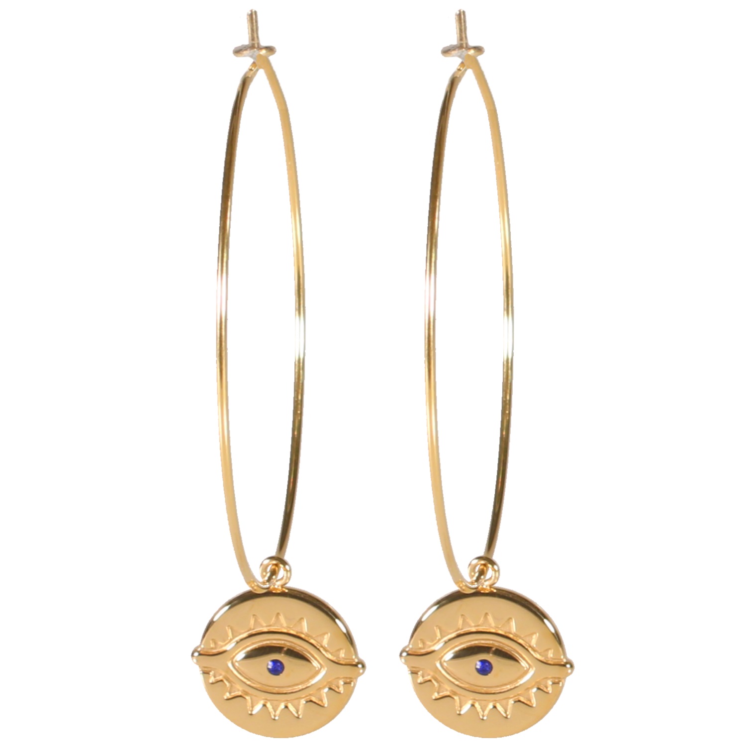 Boucles d'oreilles créoles avec pastilles motif œil en acier doré et cristaux de couleur.