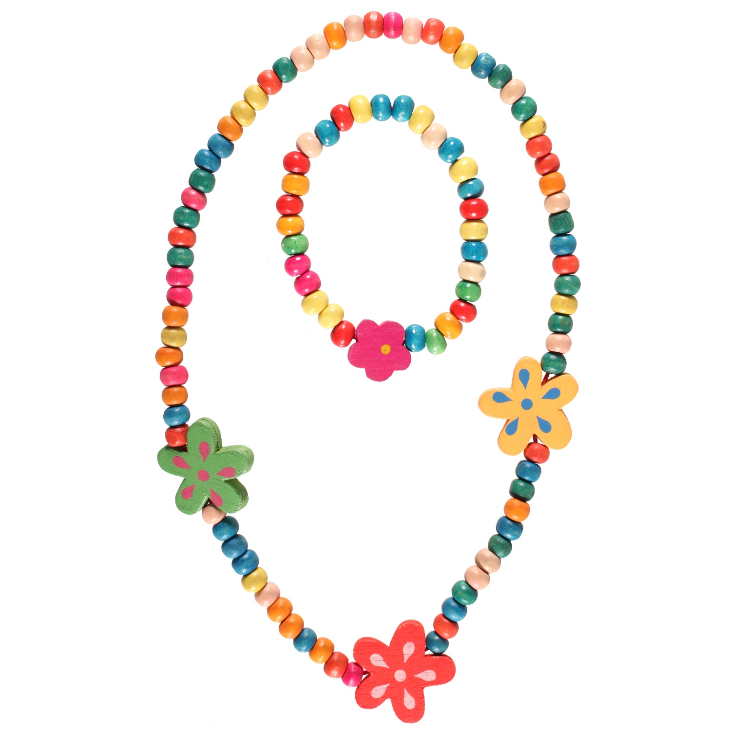 Parure pour enfants composée d'un collier et bracelet élastiques avec perles et fleurs en bois de couleur.