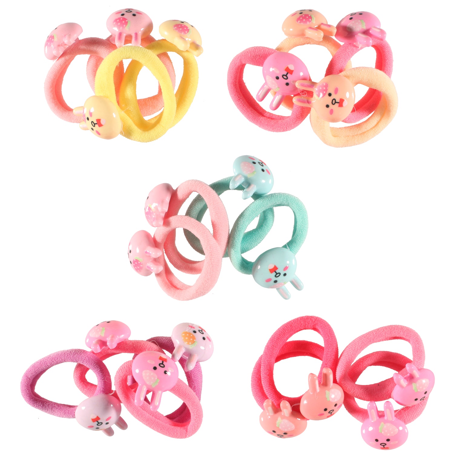 Lot de 4 élastiques cheveux pour enfants en textile de couleur et tête de lapin en plastique de couleur.
