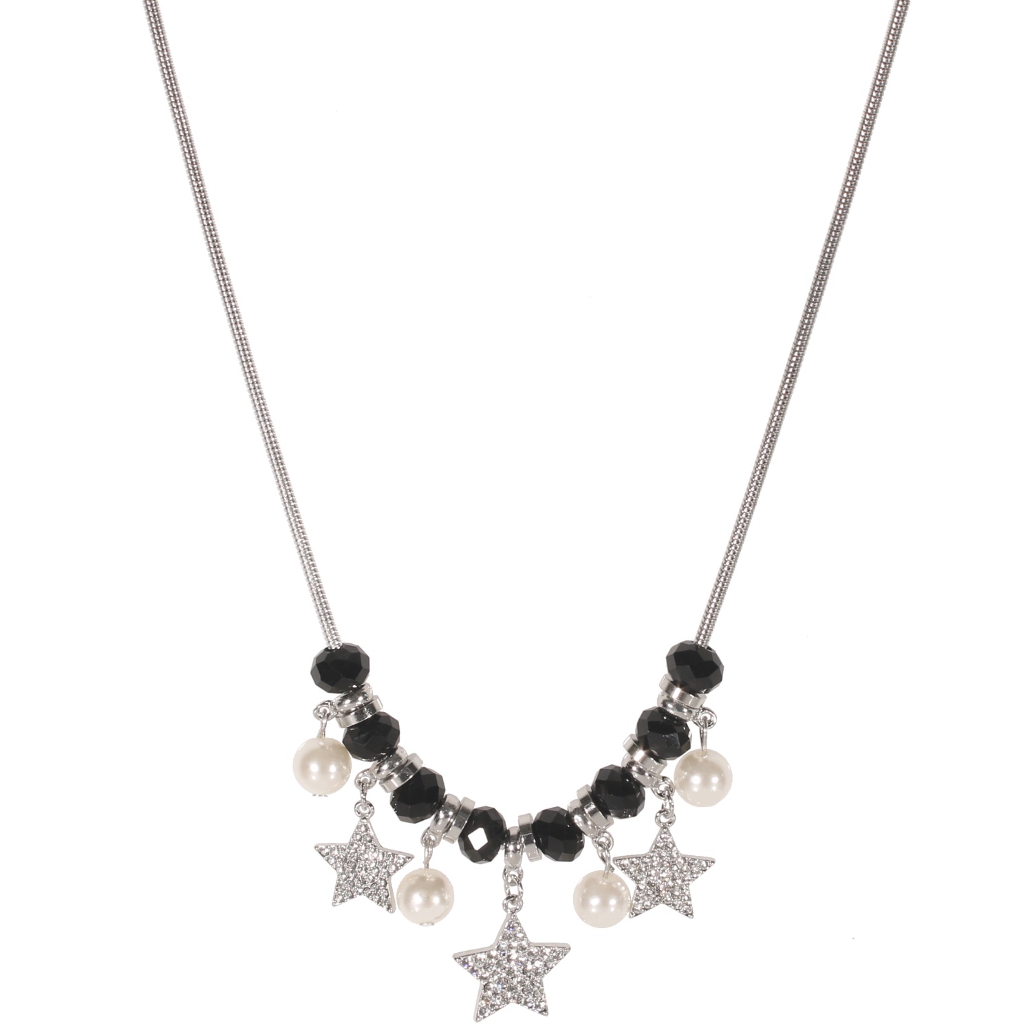 Collier fantaisie en métal argenté, perles de couleur noire et pendants étoiles pavées de strass et perles synthétiques.