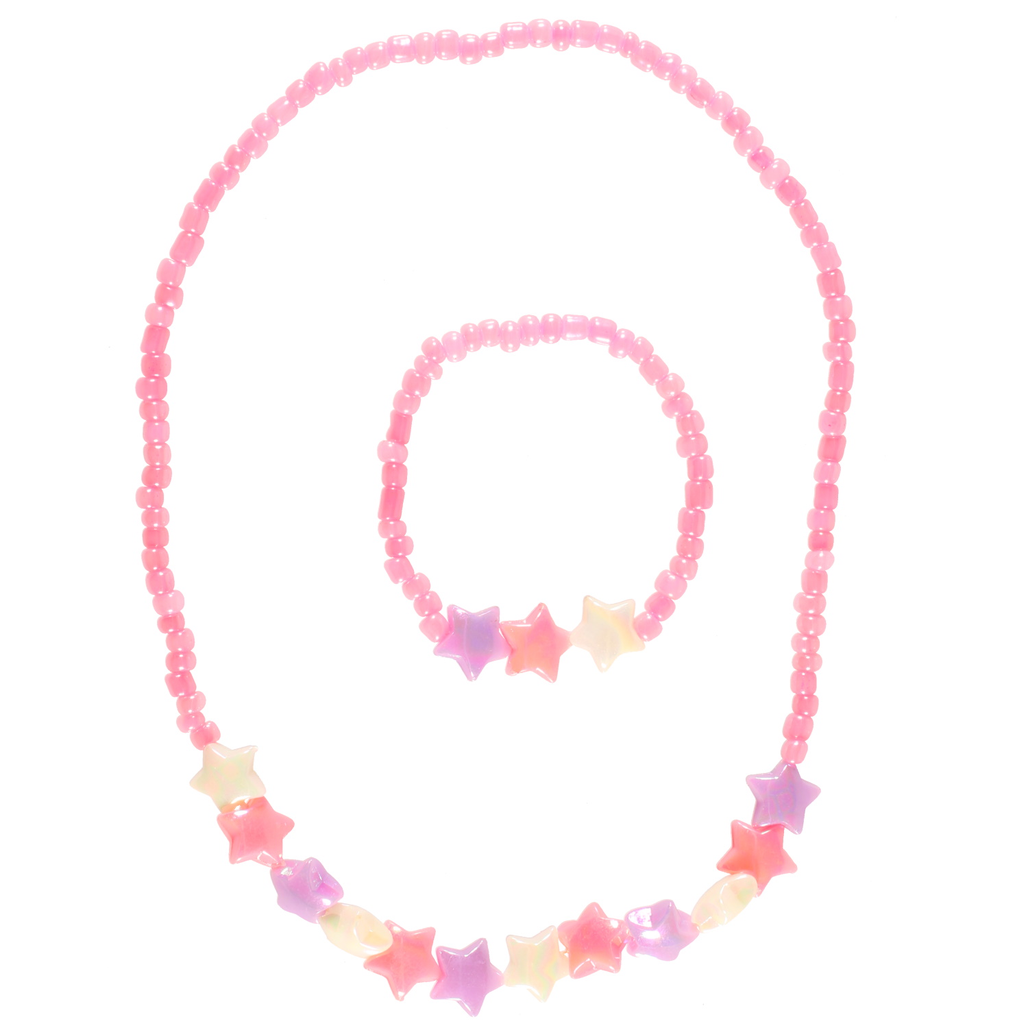 Parure fantaisie pour enfants composée d'un collier et d'un bracelet élastiques en perles de couleur de forme cylindrique et d'étoile.