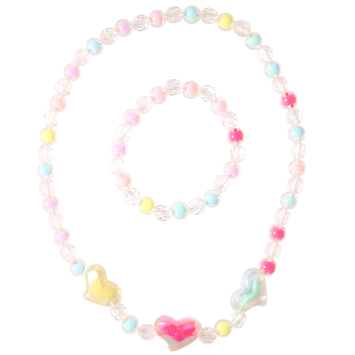 Parure fantaisie pour enfant composée d'un bracelet élastique de perles multicolores et transparentes, et d'un collier élastique de perles et de cœurs multicolores et transparentes.
