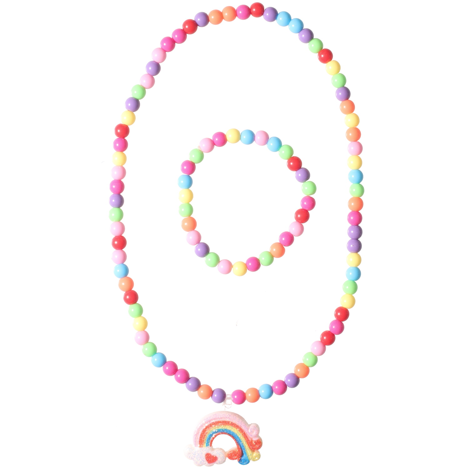 Parure fantaisie pour enfant composée d'un bracelet élastique de perles multicolores et d'un collier élastique en perles multicolores avec un pendentif arc en ciel pailleté.