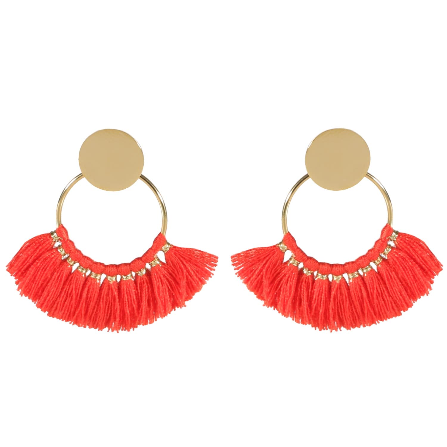 Boucles d'oreilles pendantes cercles en acier doré et pompons en textile.