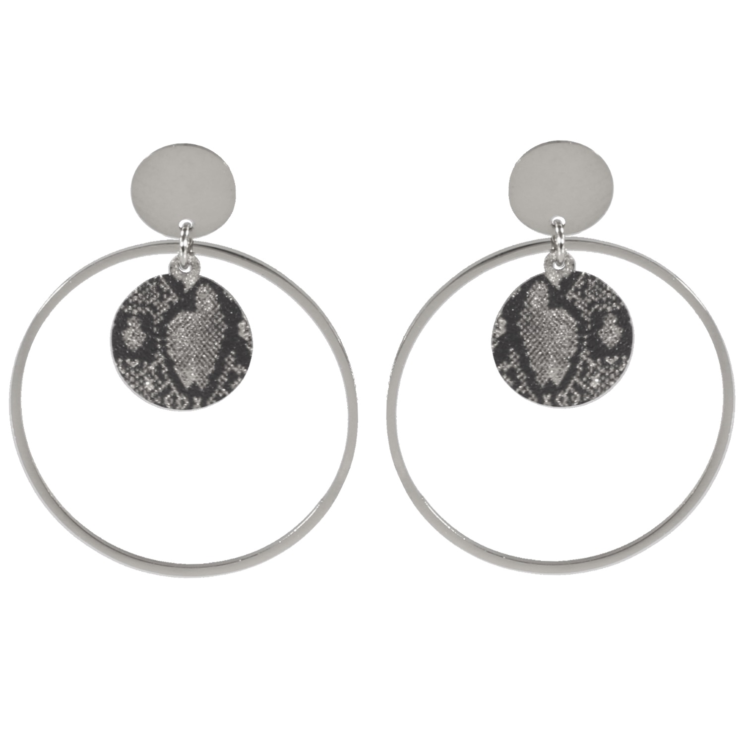 Boucles d'oreilles pendantes composées d'une pastille ronde lisse et d'un cercle en acier argenté et une pastille ronde recouverte de motifs en émail.