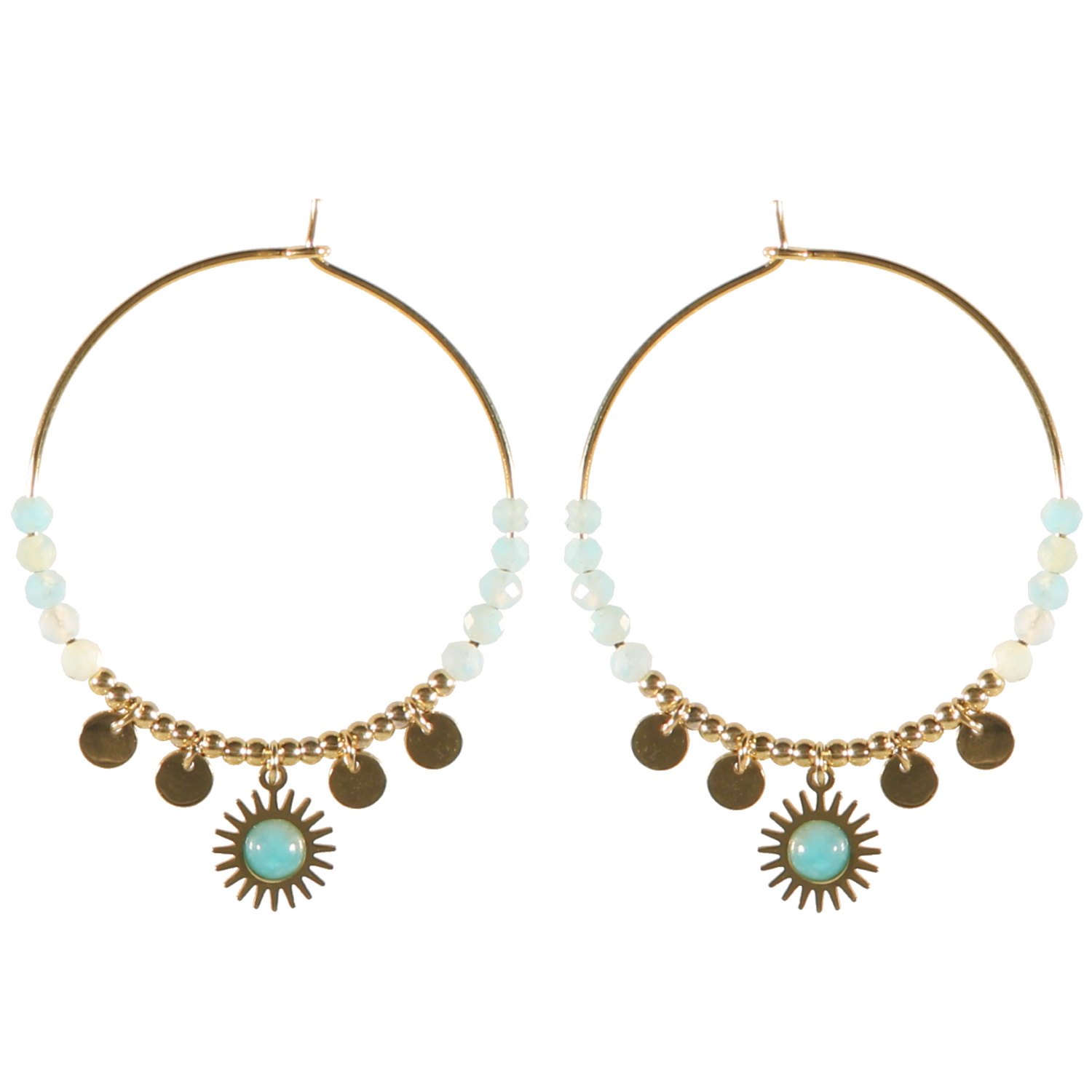 Boucles d'oreilles créoles en acier doré surmontées de perles de couleur en pierre naturelle et en acier doré et d'un soleil pendant en acier doré surmonté d'une pierre naturelle de couleur.