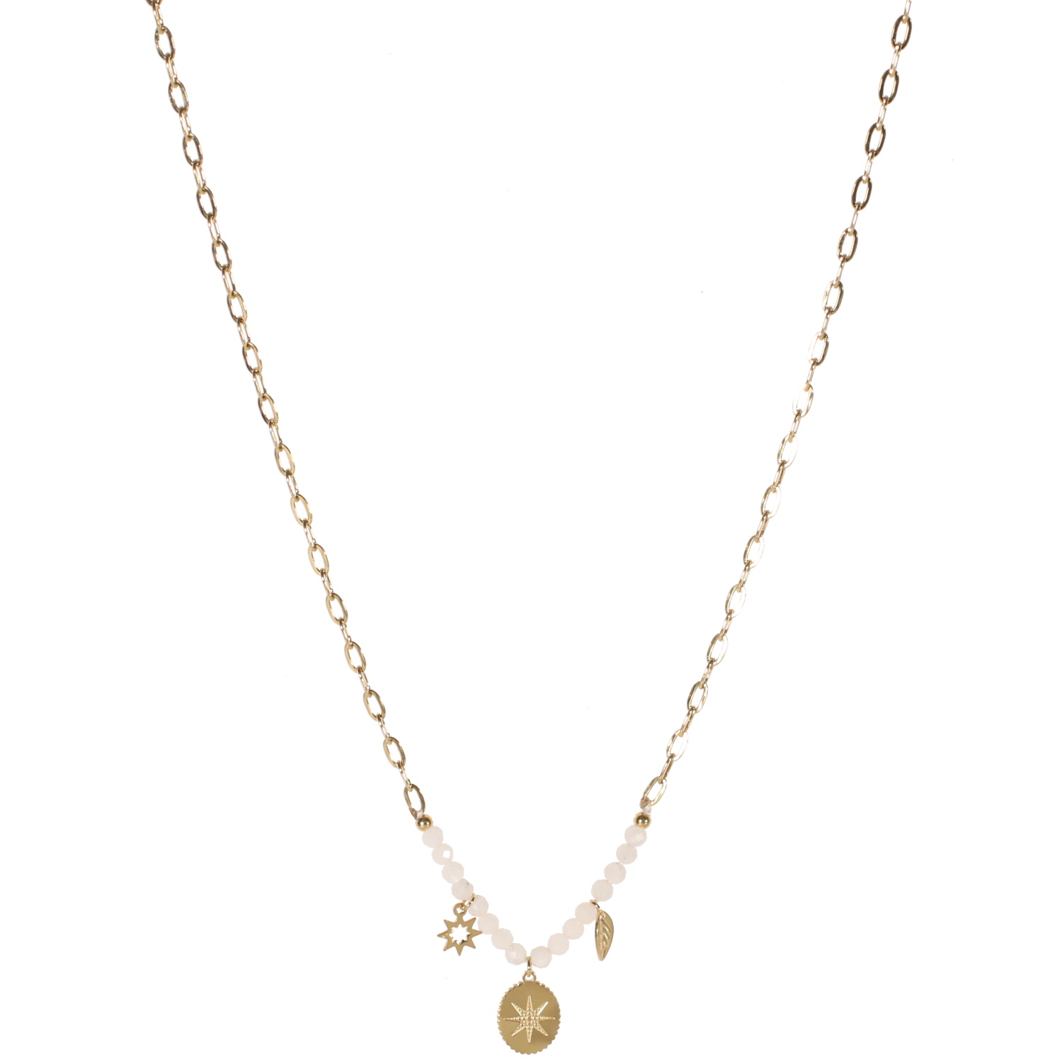 Description Collier composé d'une chaîne avec pendants étoile et feuille et pastille ovale avec motif d'étoile en acier doré et des perles de couleur blanche. Fermoir mousqueton avec 5 cm de rallonge. Cliquez sur une matière, un thème, une couleur ou une collection pour voir tous les articles associés.