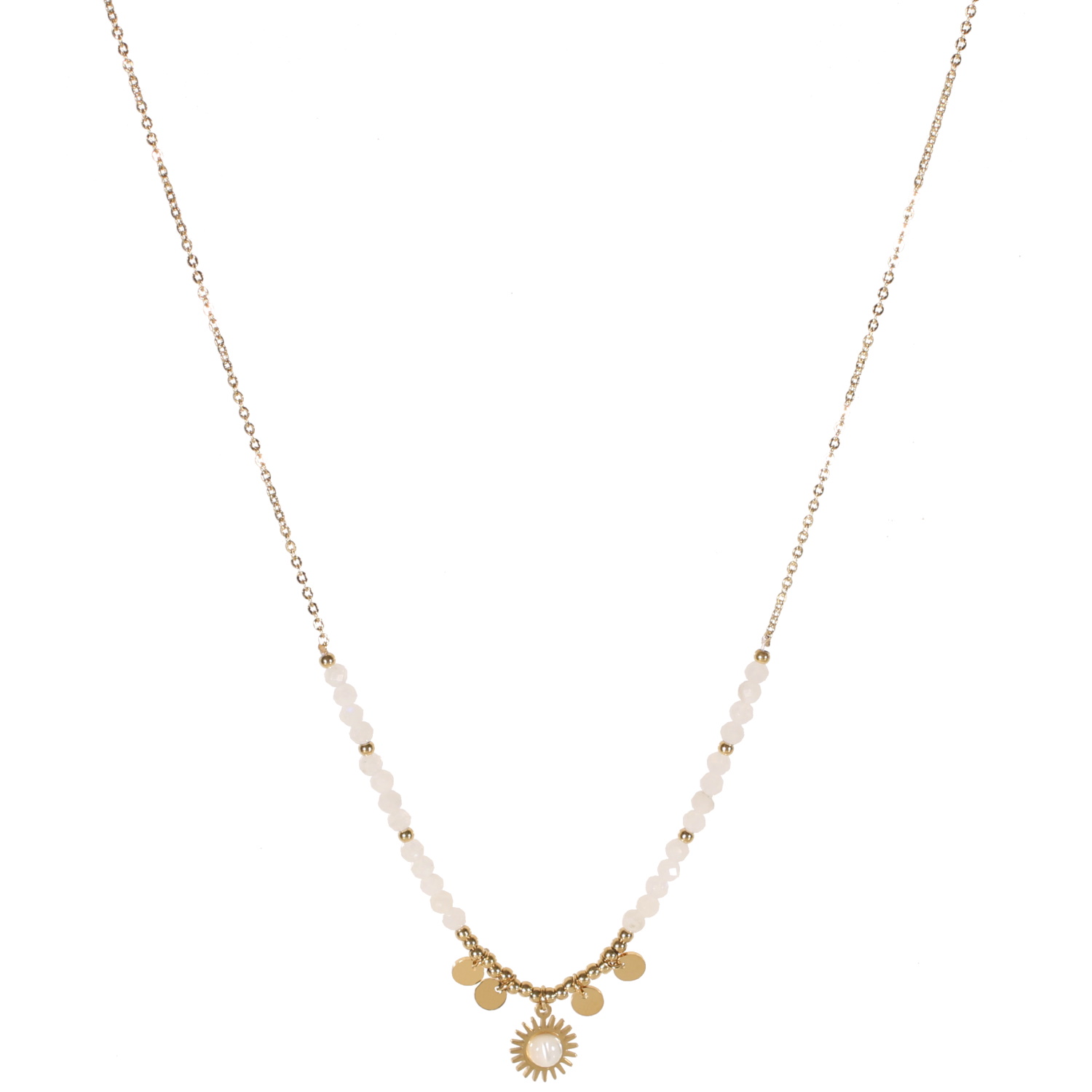 Collier composé d'une chaîne avec pampilles rondes et perles en acier doré, perles en pierres naturelles de couleur blanche et un pendentif au motif du soleil en acier doré surmonté d'une pierre naturelle de couleur blanche.